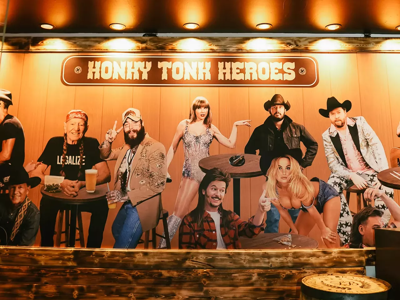 The Honky Tonk Heroes Mural at Not My First Rodeo greets patrons with a host of Nashville’s most famous, along with Joe Dirt.