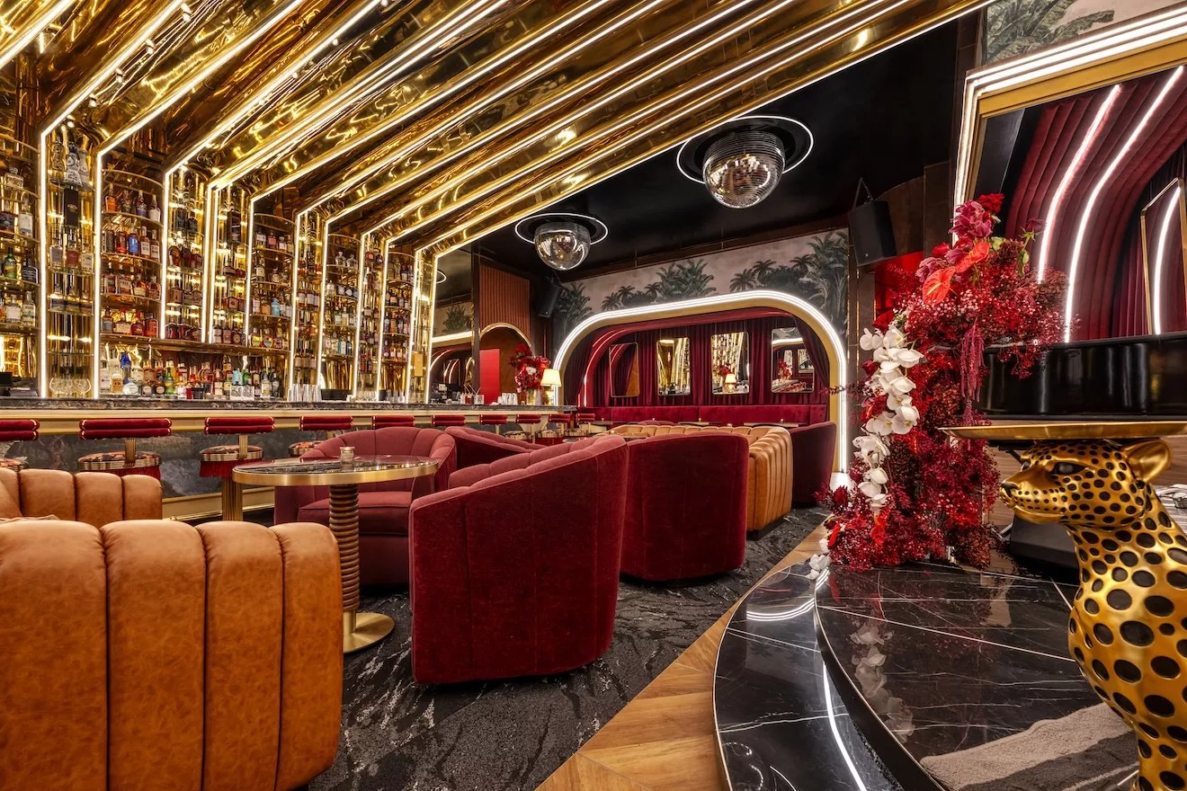 Four giant disco balls spin overhead, framing the centerpiece: a golden fixture that wraps around the bar, up and over the ceiling, and cascades down behind the stage. Behind the bar, expert bartenders mix unique drinks, and the stage will house live music every night.