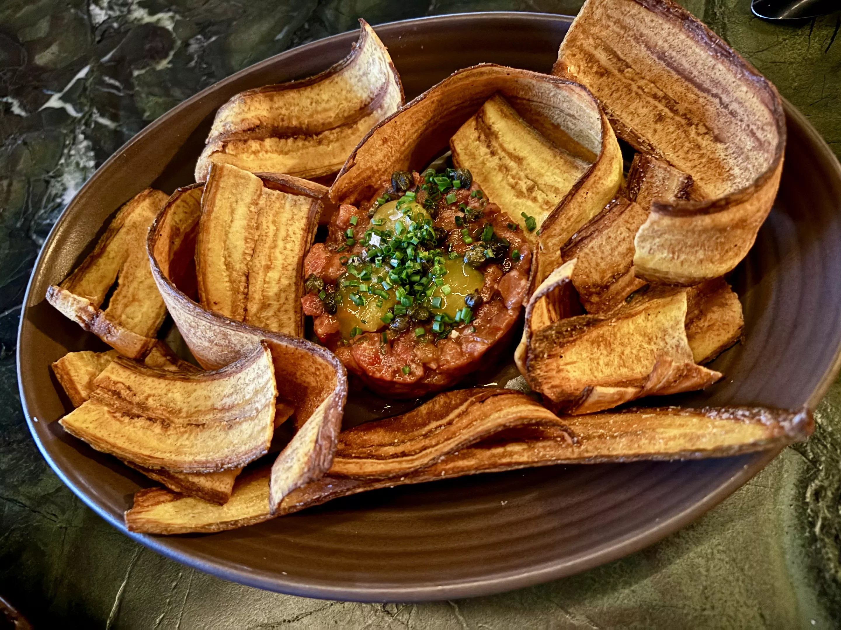 Smoky steak, a bright citrusy marinade and sweet and salty plantain chips all work together to create a delicious bite in Filthy Animal’s Wood-Fired Beef Tartare.
