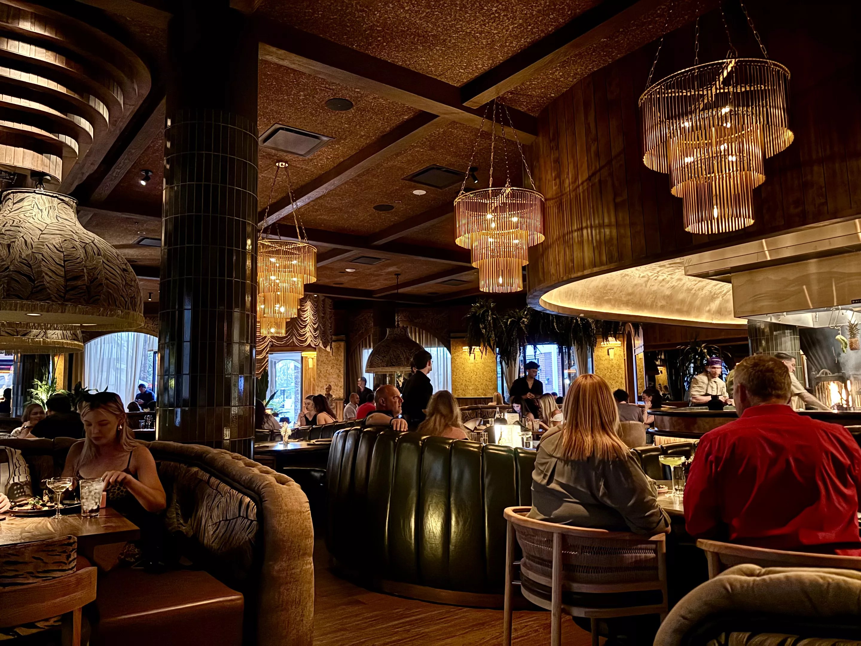 The gorgeous space envelops you. The windows are intentionally draped in curtains that blur the outside noise, and the restaurant transports you far from Tempe. Servers dressed in vintage-inspired tan dresses twirl around the room. Sparks from the central fire rise toward the tall ceiling as the flames pop and crackle. With dinner and a show, this spot would be right at home in a high-end Las Vegas resort.