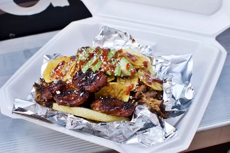 Que Sazon’s arepa is like a really serious taco. Cornmeal cake provides the base for slow-cooked pork, sliced chorizo, fried plantain, avocado, and their homemade signature barbecue sauce.