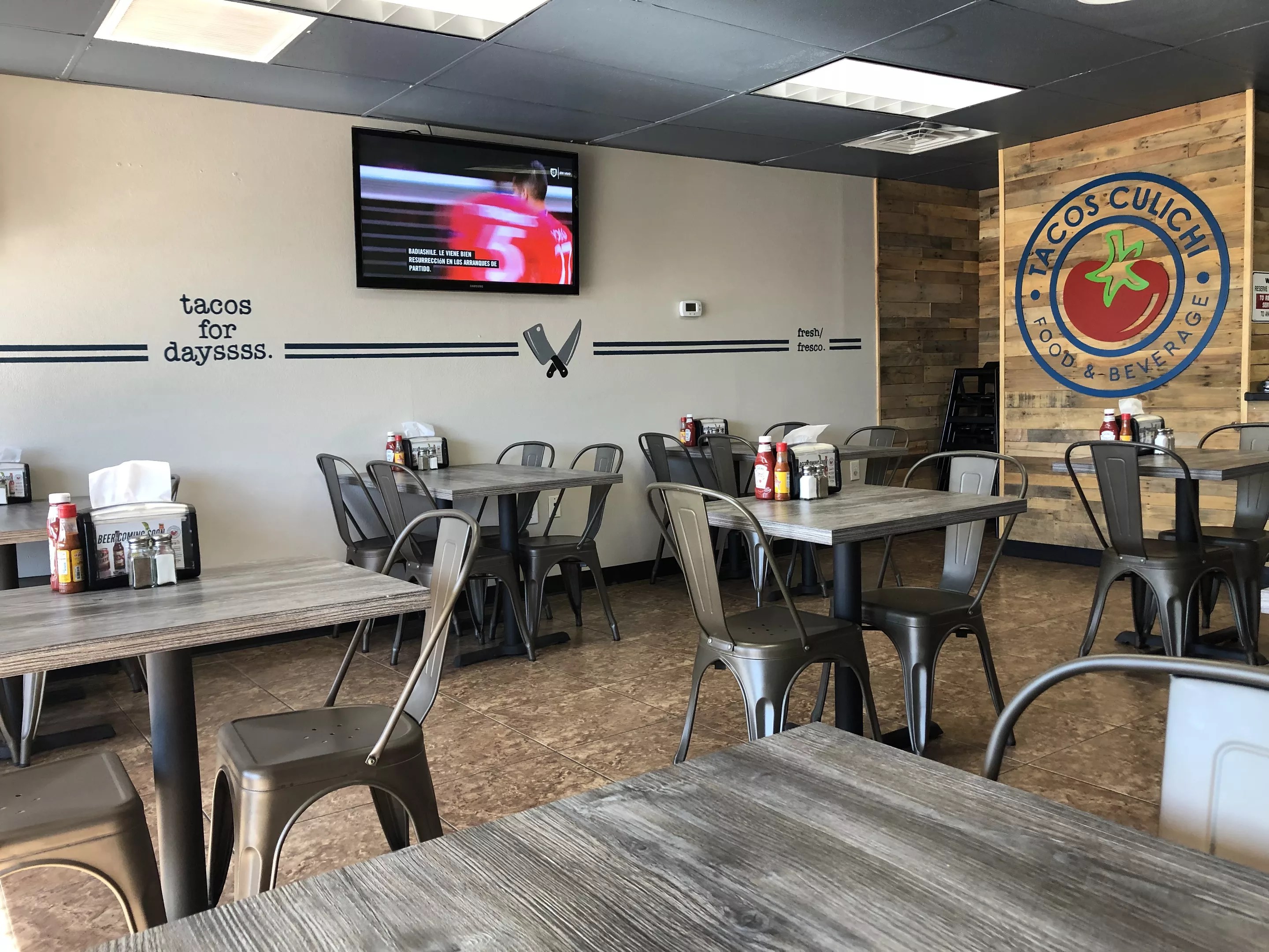 Tacos Culichi is clean, from newness or from habit. It has been constructed and furnished on the modern and spare side, with TVs showing sports and a fluorescent gleam on a smooth, rich wooden floor. Tables are of a soft, gray wood. Chairs are metallic and lean.