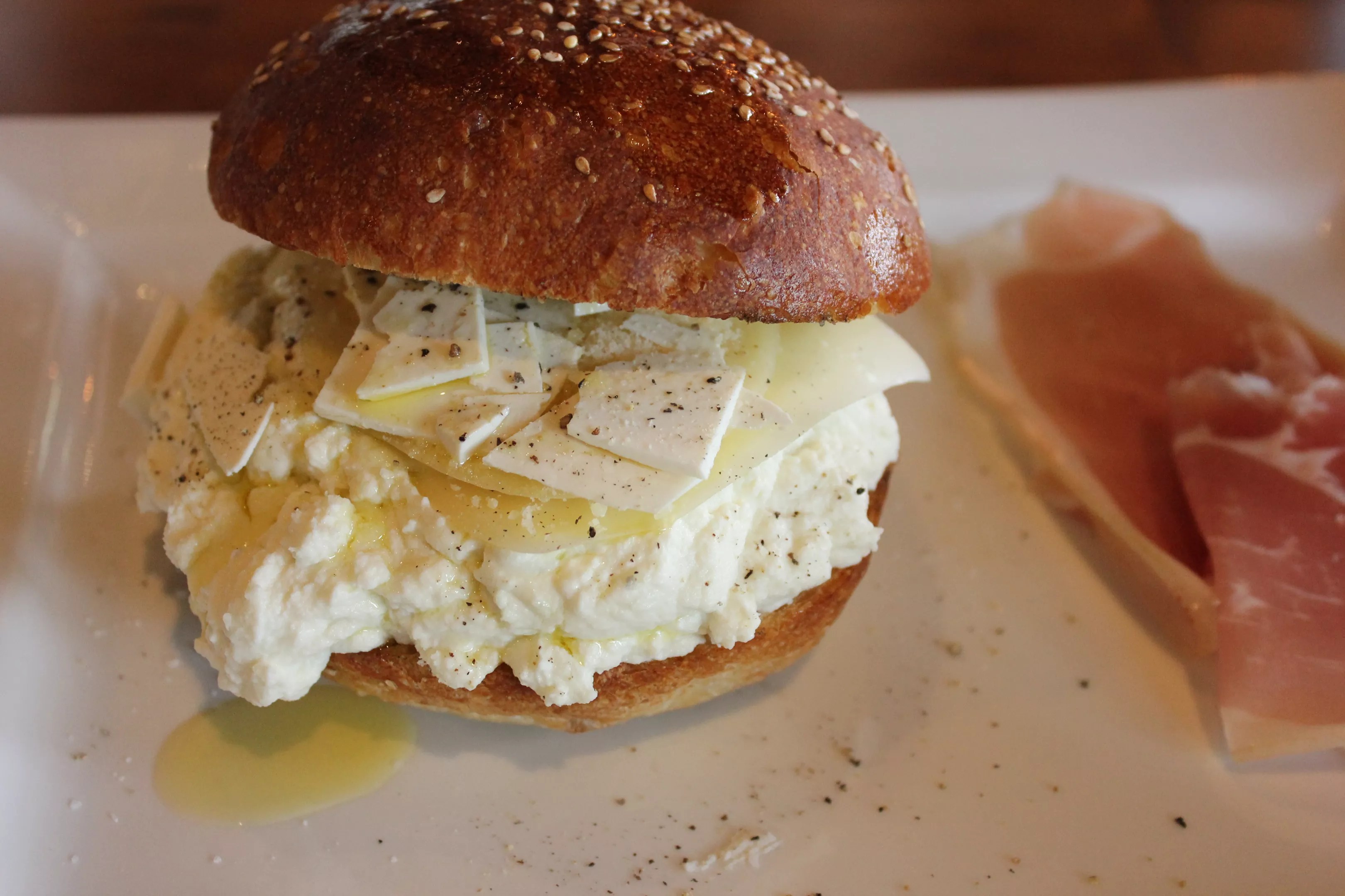 Vastedda con ricotta, a mufuletta bun stuffed with ricotta, two other cheeses, and olive oil.