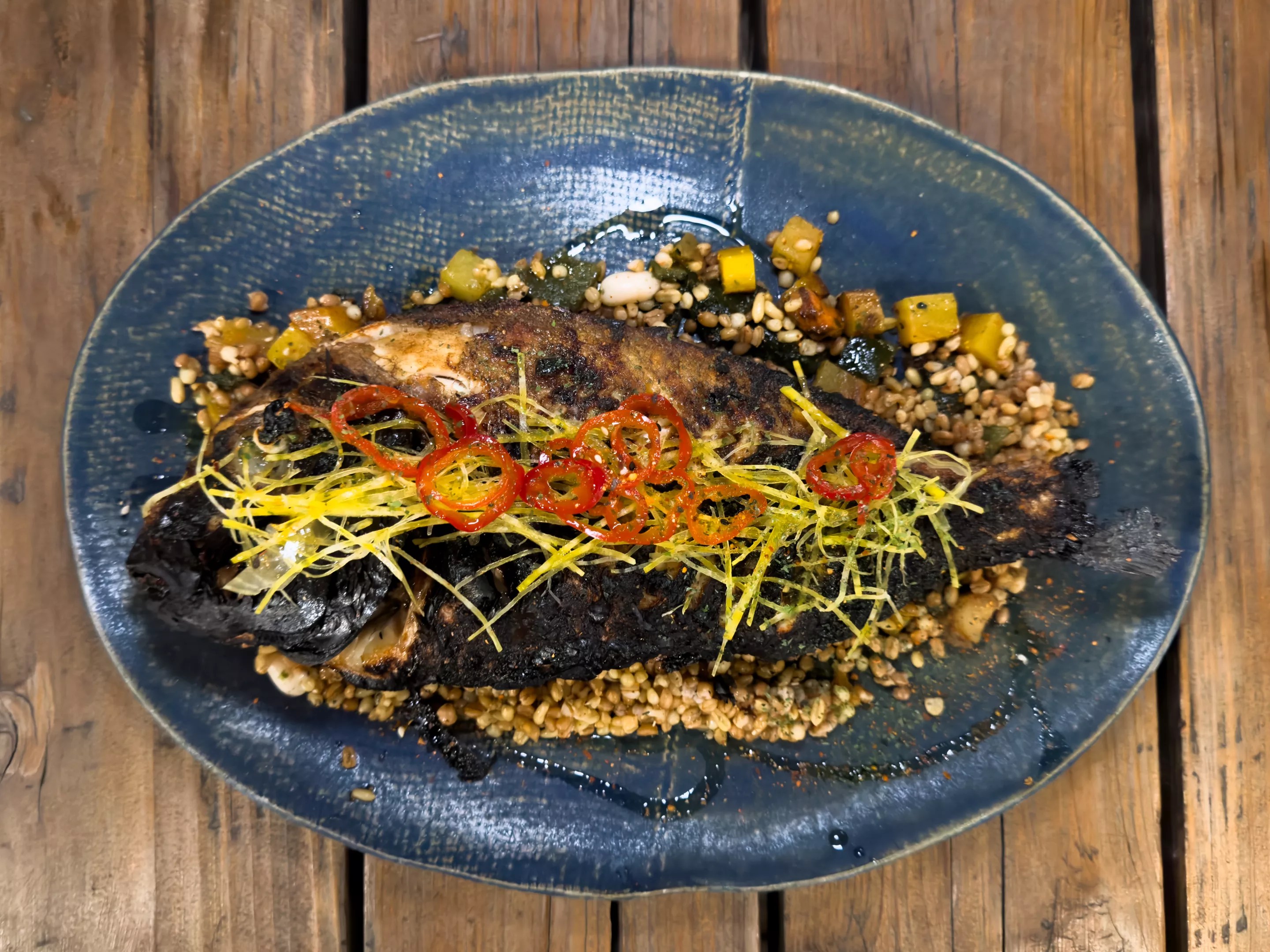 The whole roasted fish at Pa’La is a showstopper, seasoned and charred to black and served on a bed of ancient grains and roasted vegetables.