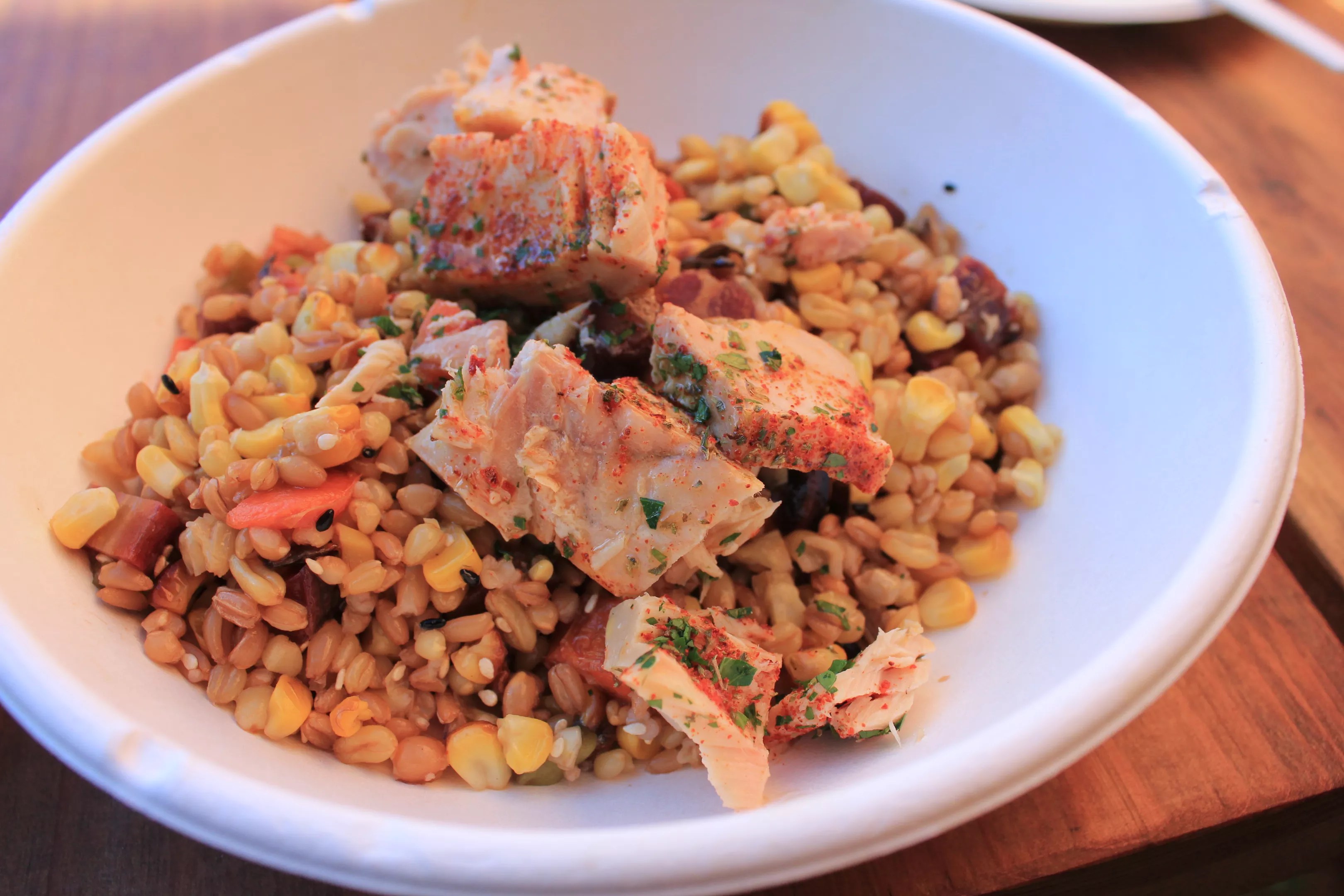 The day I visited, Urciuoli was using grain from BKW Farms (near Tucson), specifically a blend of five whole grains: kamut, spelt, Sonora wheat, einkorn, and durum. These came cooked to minimum softness, with close but slightly different degrees of bite depending on grain type. Scattered through were roasted Anaheim pepper, charred delicata squash, cannellini beans, toasted seeds (sunflower and sesame), and a hint of highfalutin soy sauce made with Adriatic sea salt in terracotta vessels.