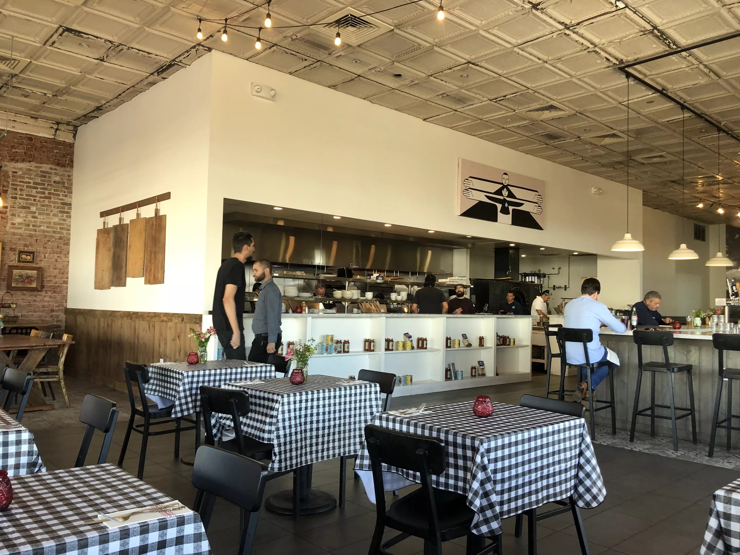 Red brick and checkered tablecloths inside Pane Bianco Van Buren.