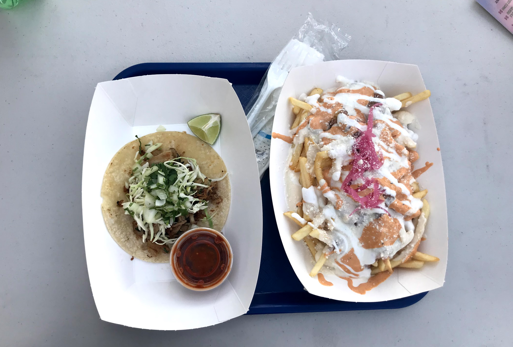 The carnitas taco is $3 and features braised pork butt, shredded cabbage, and onion, or opt for the $6 Cholo Fries, topped with queso, house beans, and cream. Other menu items include carne asada, chicken tinga, and pork belly burritos. There’s a breakfast menu, too.