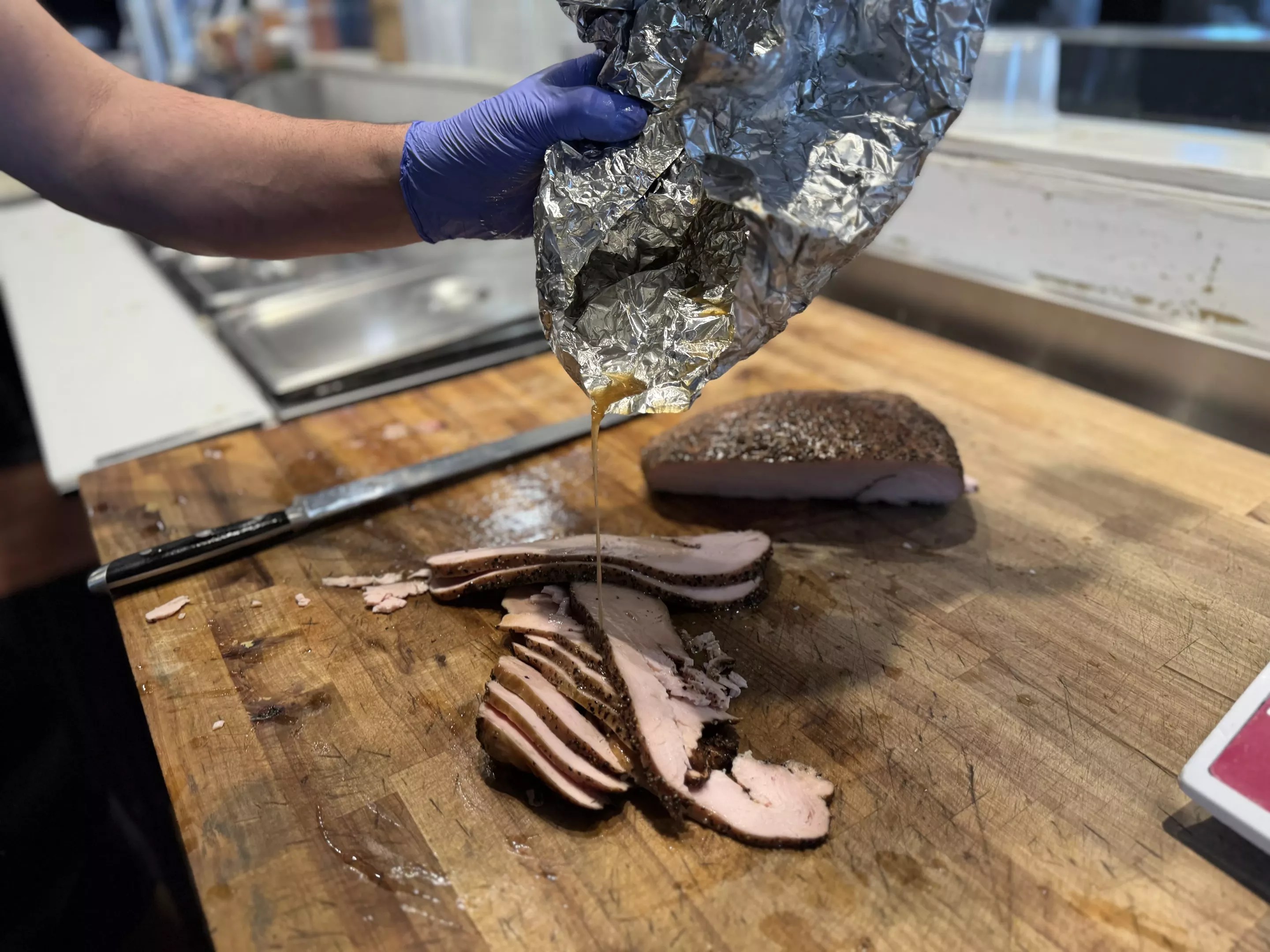 Each spot has their own approach to crafting mouth-watering turkey. At Caldwell, turkey breasts are seasoned with salt, pepper and garlic before heading to the smoker, which is fueled largely by mesquite wood. Finished turkeys are rested in melted butter and apple juice.