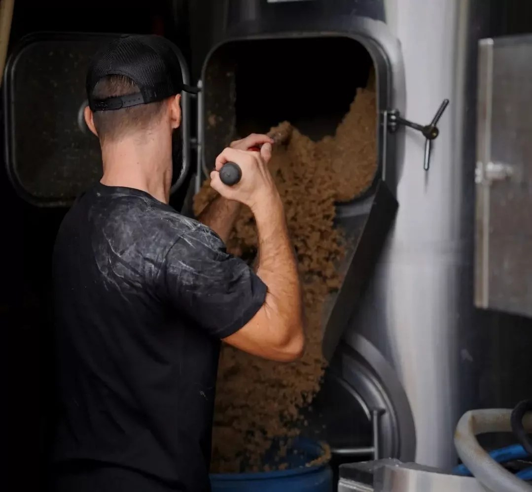 “If you want to think of a big pot of oatmeal, that’s kind of what it looks like,” McClelland says. “Sugar comes out of the grain, and we use that sugar in our beer. Beer is basically wort that ferments, and wort is this grain sugar that comes out of that grain. Once that all liquid is through the system, we’re left with not 500 to 1,000 pounds of grain; now it’s wet, so we’re left with a couple thousand pounds.”
