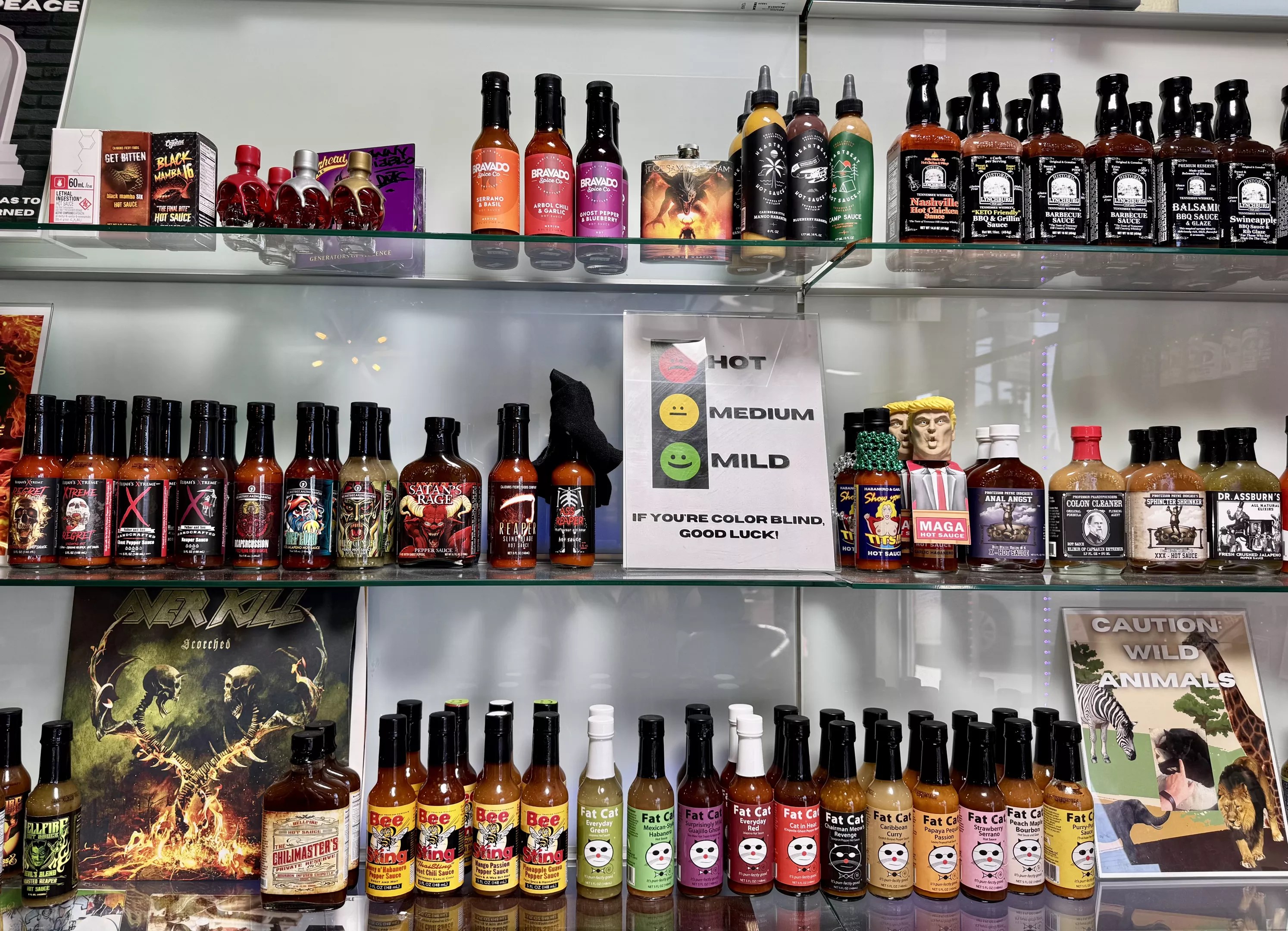 Some of these sit alongside sauces whose packaging or names make them ripe for jokes and white elephant gifts. There’s a garlic habanero MAGA Hot Sauce with President Donald Trump’s head as the cap sharing shelf space with Ass Blaster Hot Sauce and Professor Phardtpounders Colon Cleaner Hot Sauce.
