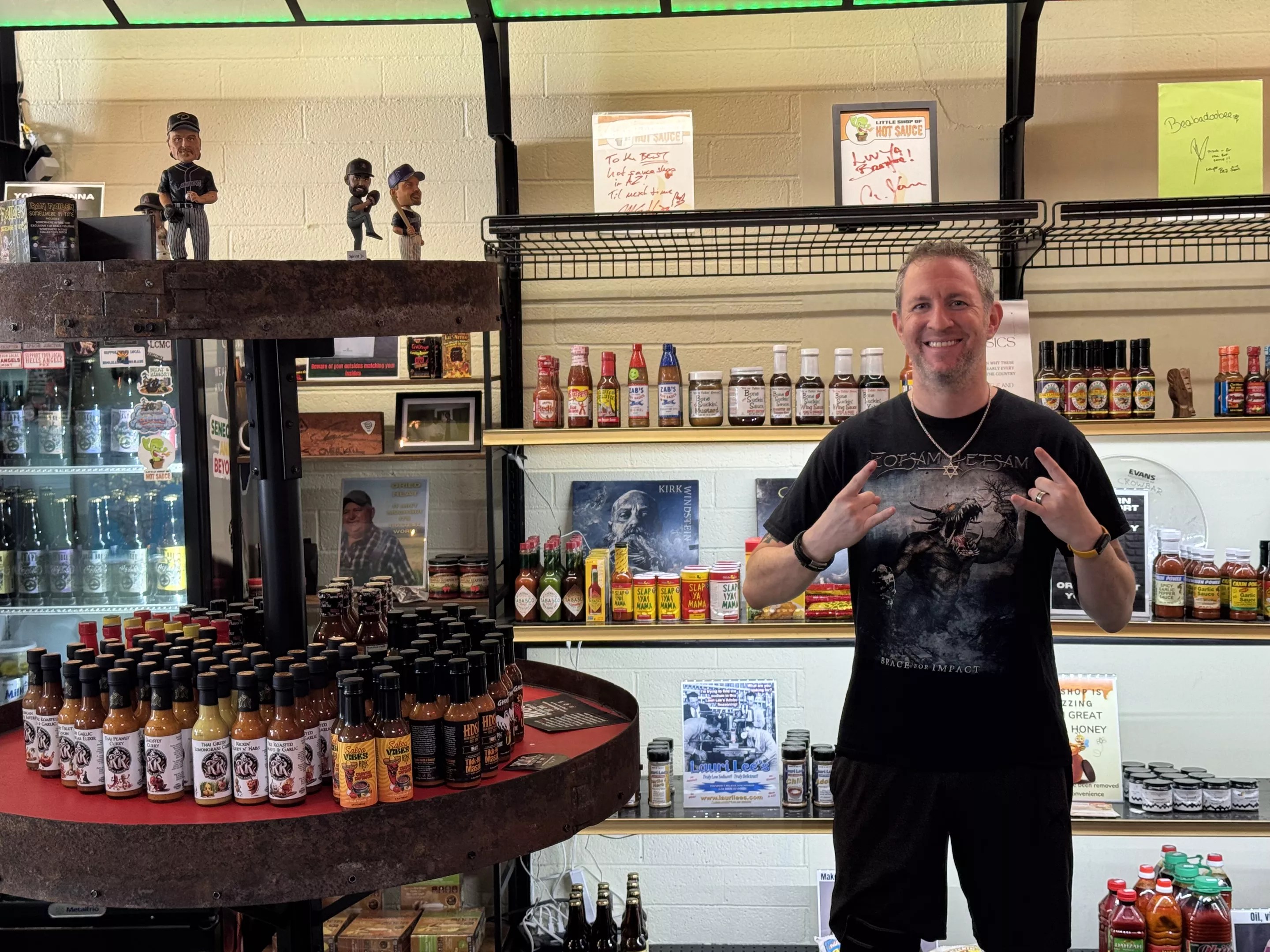 He constantly bounces around the store, talking about his favorite heavy metal bands, offering recommendations of other local businesses to check out and sharing a bit about the local sauces he carries.