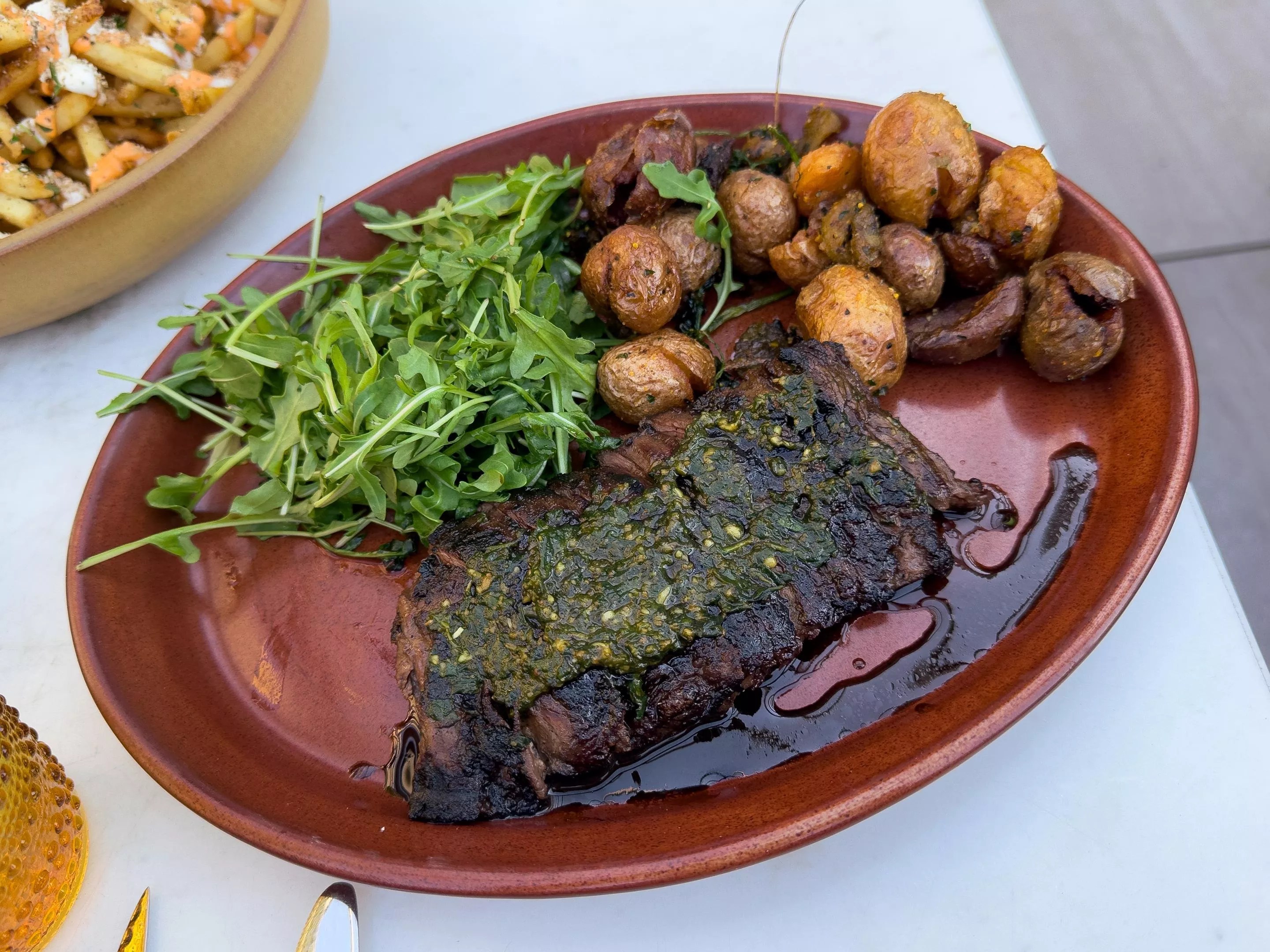 One of Thea’s better dishes, a grilled skirt steak, is smothered in a muddy pesto.