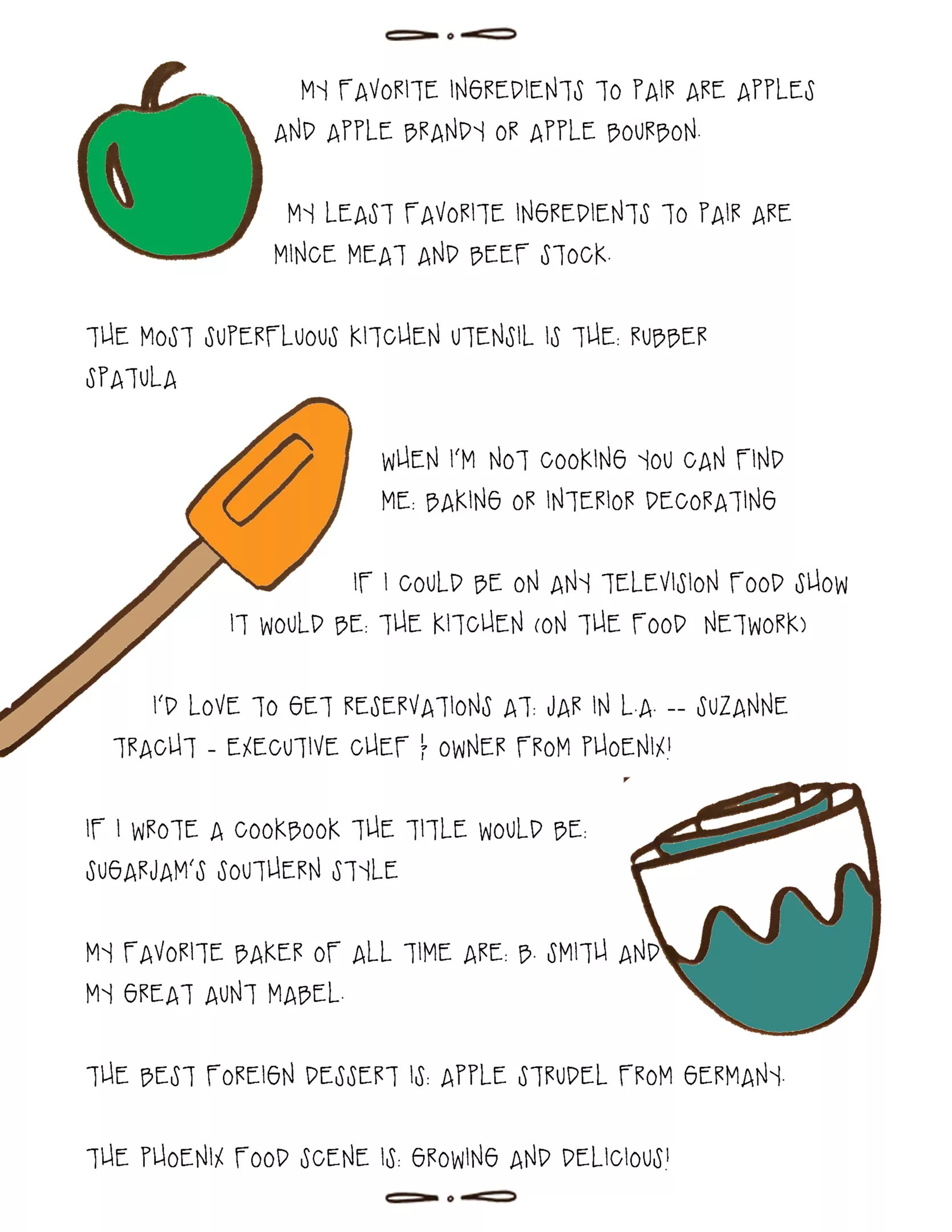 Phoenix New Times and Roosevelt Row present the eighth annual Pie Social on Sunday, November 19 – from 2 p.m. till the pie runs out – at Margaret T. Hance Park, 67 West Culver in Phoenix. Pay $15 for five tasting tickets or bring two pies for five tasting tickets. We’ve got the forks – and a line-up of celebrity chefs we’re profiling from now till the event. Now up: Dana Dumas. Illustrations by Claire Lawton