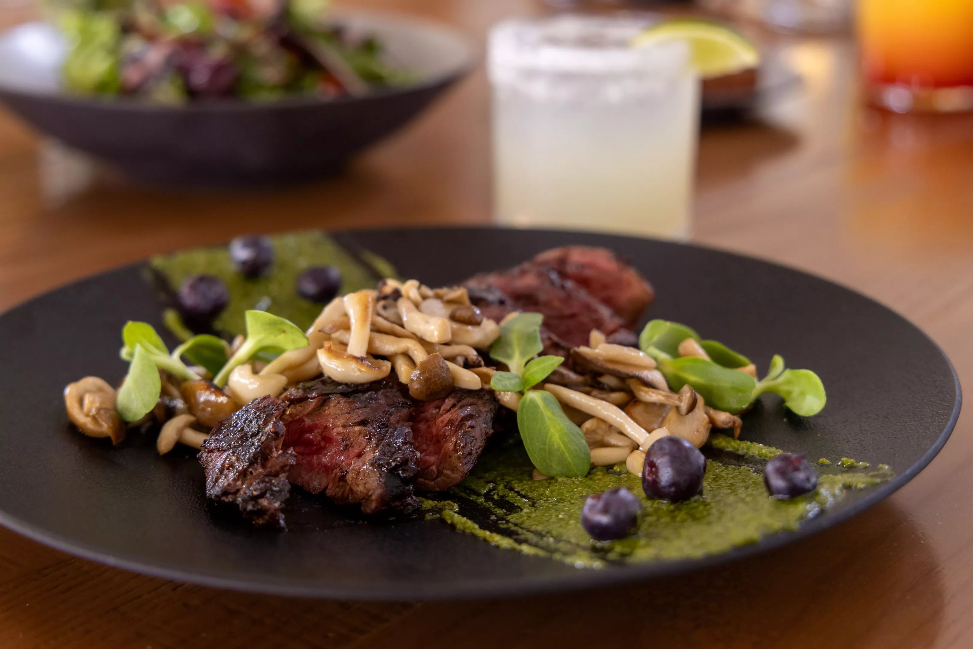 The charred hanger steak accompanied by wild mushrooms, pickled blueberry and sunflower pesto is on the special summer menu at Mowry & Cotton.