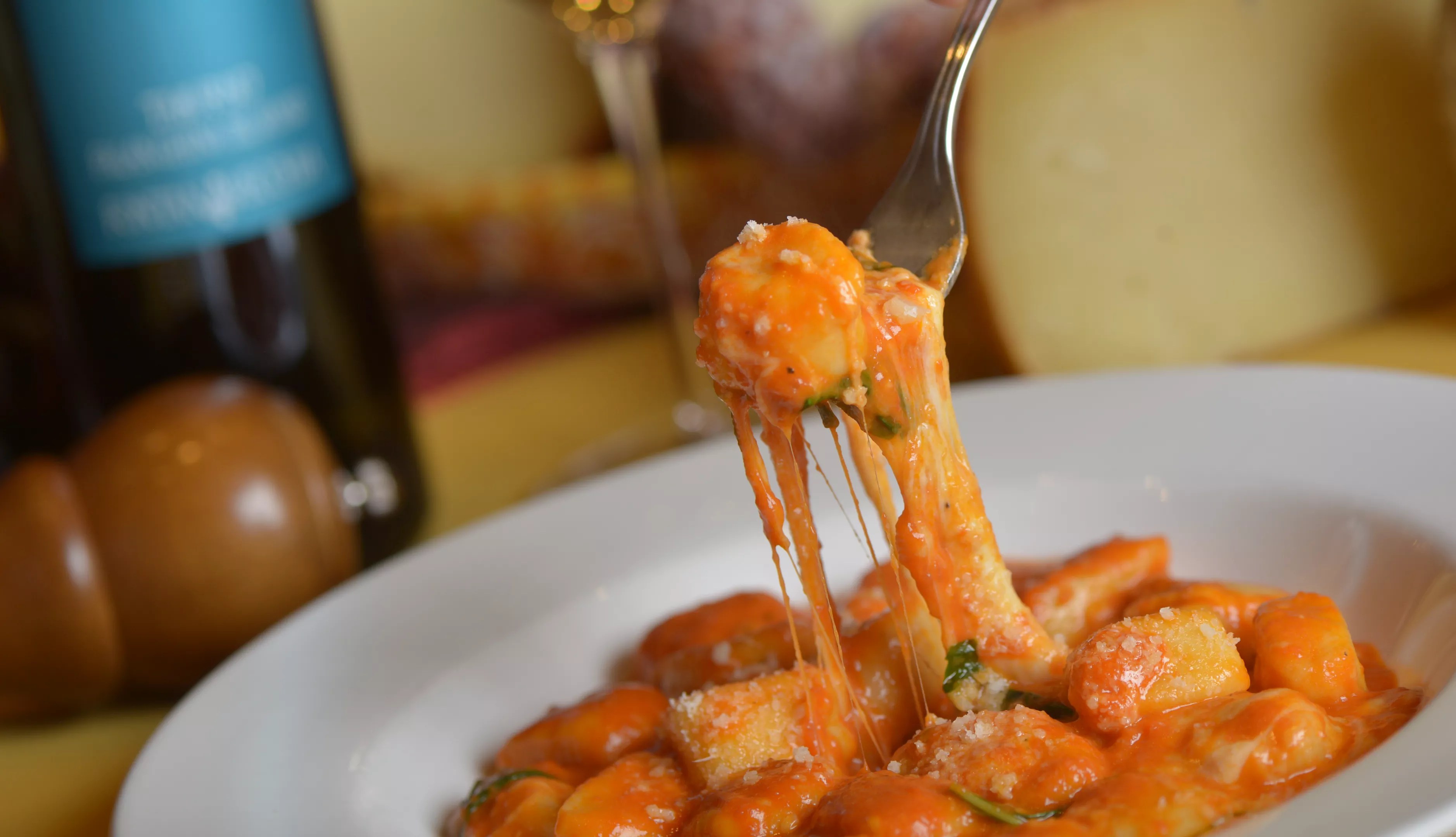 For the second course, choose from one of the handcrafted pastas, Gnocchi Sorrentina or Pacchetti, or the Pollo Saporito featuring a chicken breast sautéed with mushrooms, sun-dried tomatoes and pine nuts in a light tomato sauce, served with oven-roasted potatoes and vegetables.