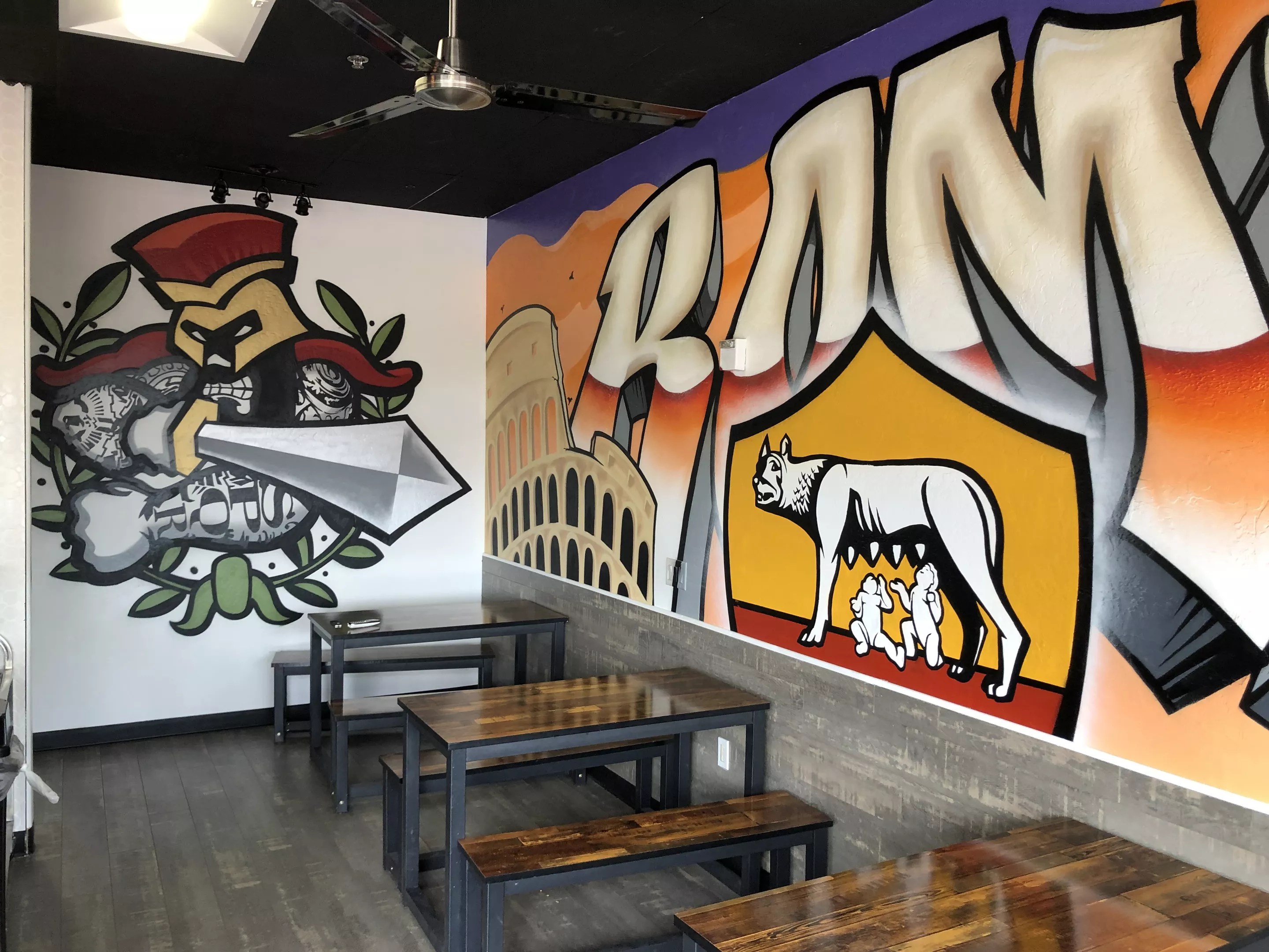 Inside Piazza Romana, a mural with the sunset hues of an arcade game spreads. It features a wolf, the animal that plays a key role in the city’s founding myth, and a square of al taglio impaled on a spear.