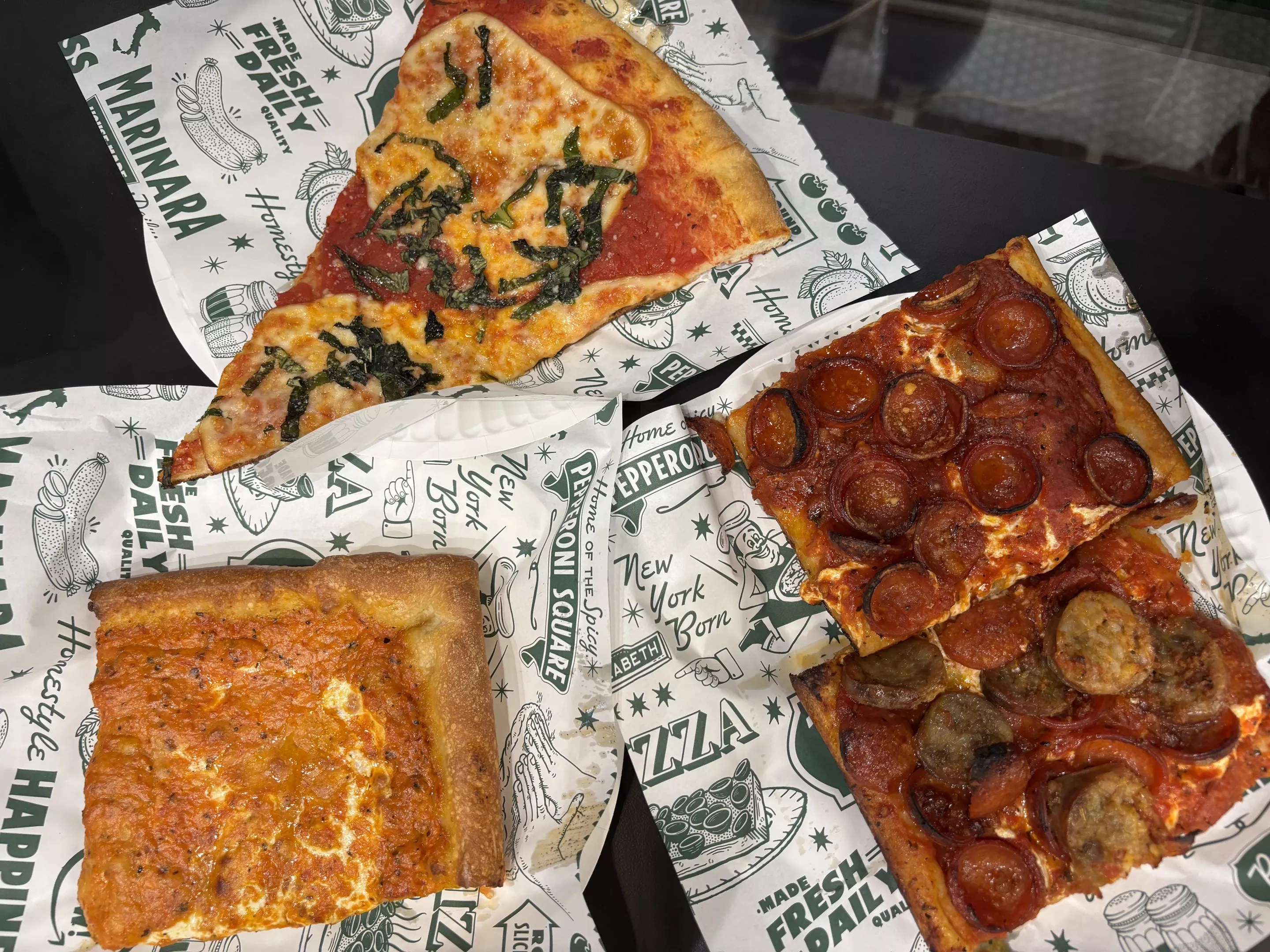 Customers can order individual slices or a whole pie of either style of pizza. Vegan and gluten-free options are also available.