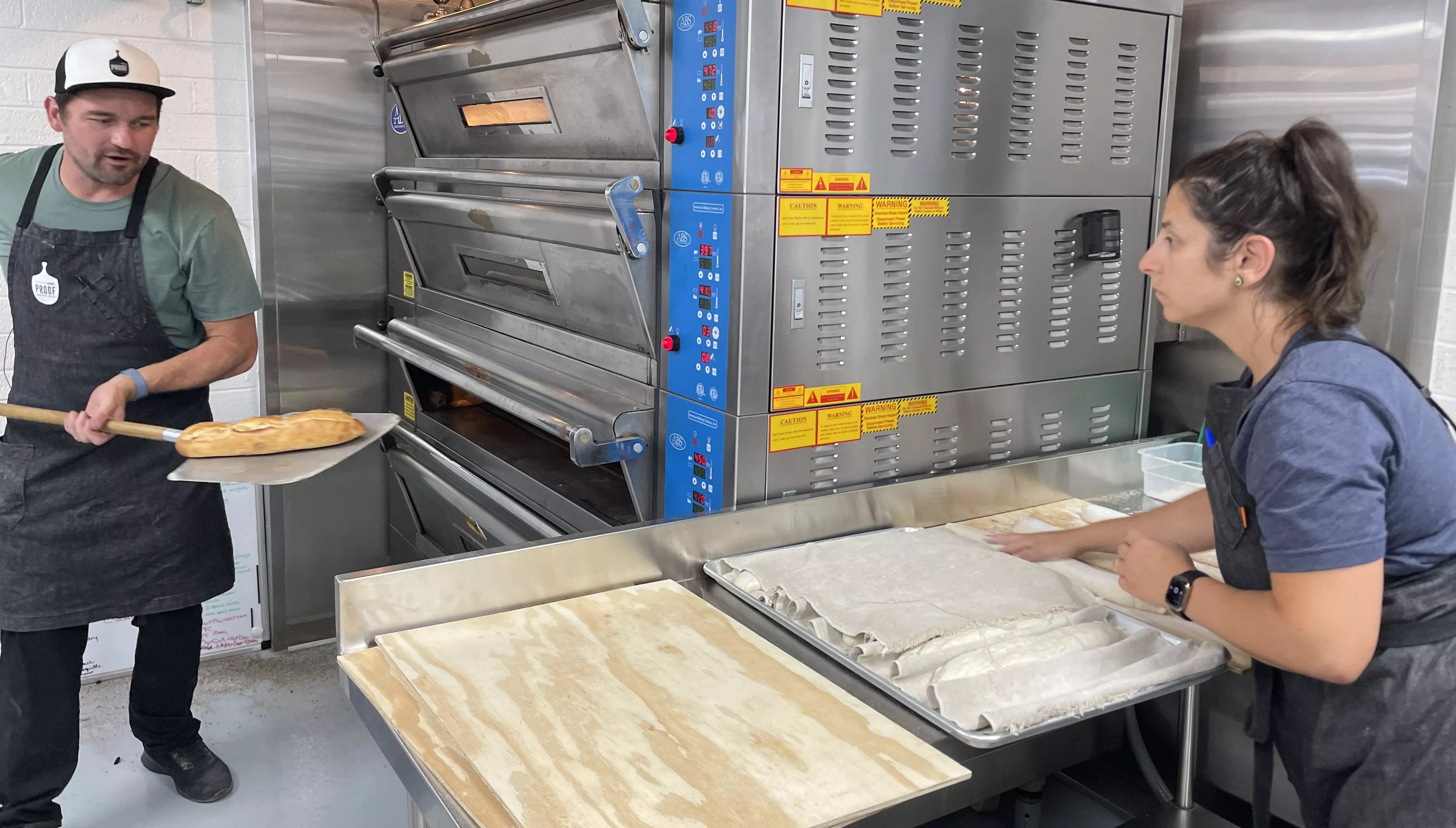 Proof Bread owners Jon Przybyl and Amanda Abou-Eid work in tandem to pull finished bread and get loaves ready to bake. The oven used when Proof was still a garage bakery is now in the Shea location.