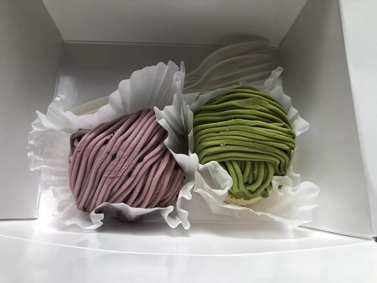 When ordering ramen, you can tack on a donburi bowl for a few bucks. Easy choice. Kuroda’s chashu pork is succulent with a measured touch of sweetness. And though steep for two small portions, I’d consider pulling the trigger on the $11 cake box. It consists of two three-bite mont blanc cakes with minimal sweetness. They’re airy and perfumed with flavors like matcha or black sesame; the tops are piped with a basketweave of colorful strands, which are paste corresponding to each cake’s respective flavor.