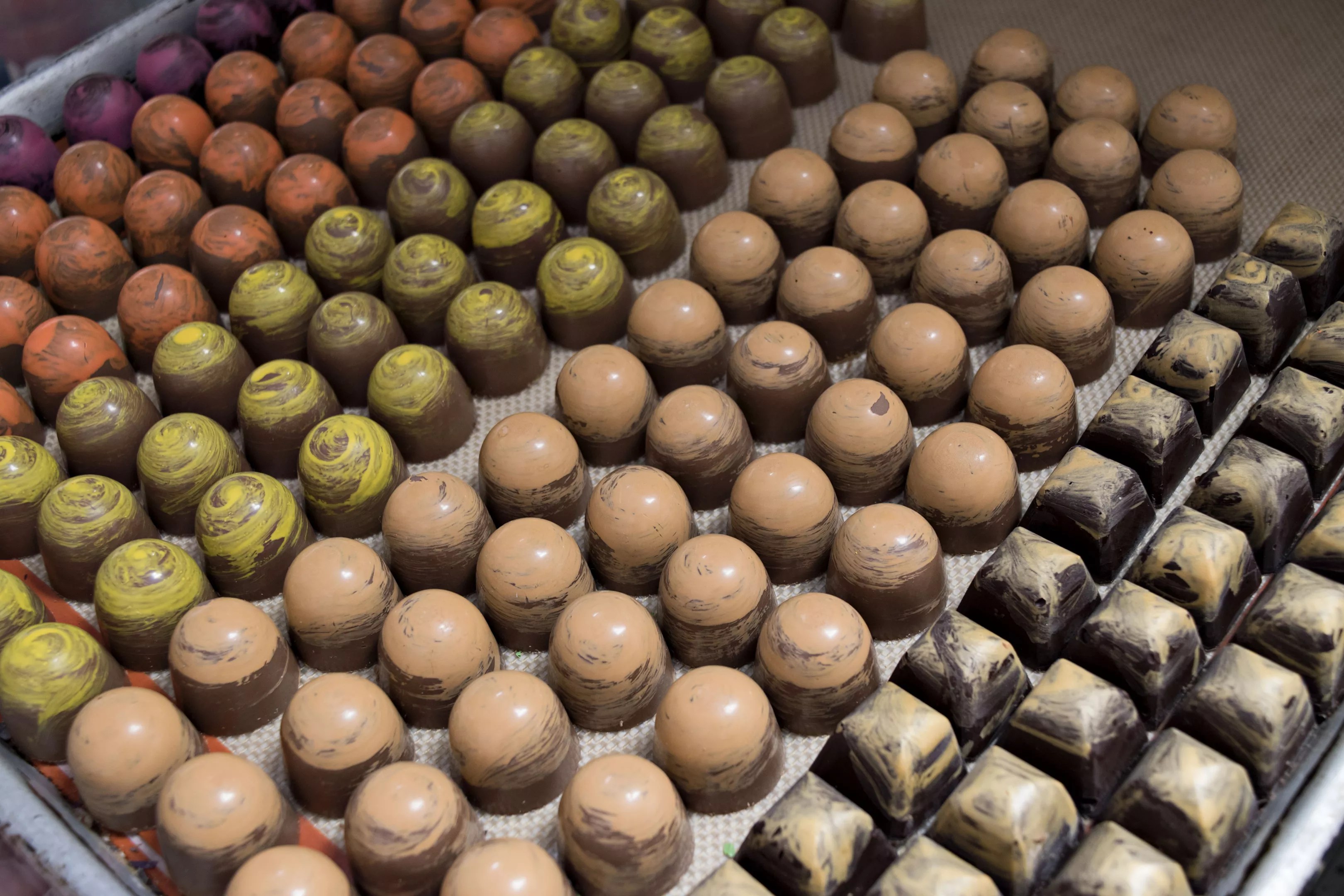 Then I noticed a smaller display case brimming with handmade chocolate truffles, glossy little domes featuring gourmet flavors like pear and champagne, many of them marbled with brilliant jewel tones. The truffles are made in-house, using premium Belgian chocolate. There are other chocolate confections, too, like Rayner’s signature chocolate high heel shoes, which are packed in clear, plastic boxes, ready to be gifted to a chocolate-loving co-worker or best friend.