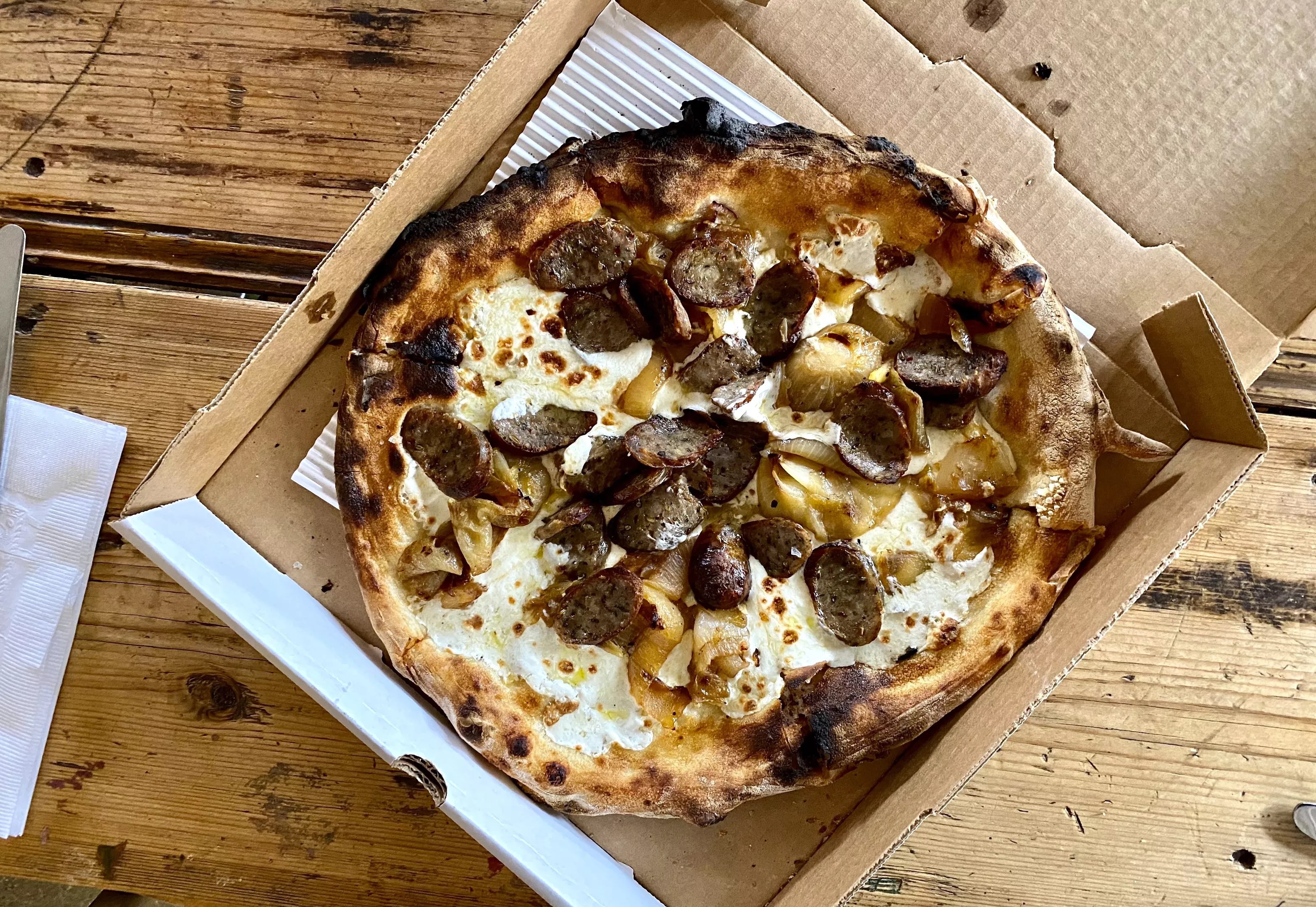 Via Della’s white pie might look too thin to deliver a meaningful mouthful, but each bite of this white wonder packs an intense punch. Covered with homemade white sauce, mozzarella, and grated Reggiano, the flatness of the crust lets the cheese pop – and then you’re hit a burst of caramelized onion that adds a jammy sweetness in all the right places. The journey ends with a lavash-like crust studded with sesame seeds for a nutty finish. Eating it on a paper plate in the revamped warehouse space on Fifth Avenue and Van Buren only adds to the allure.