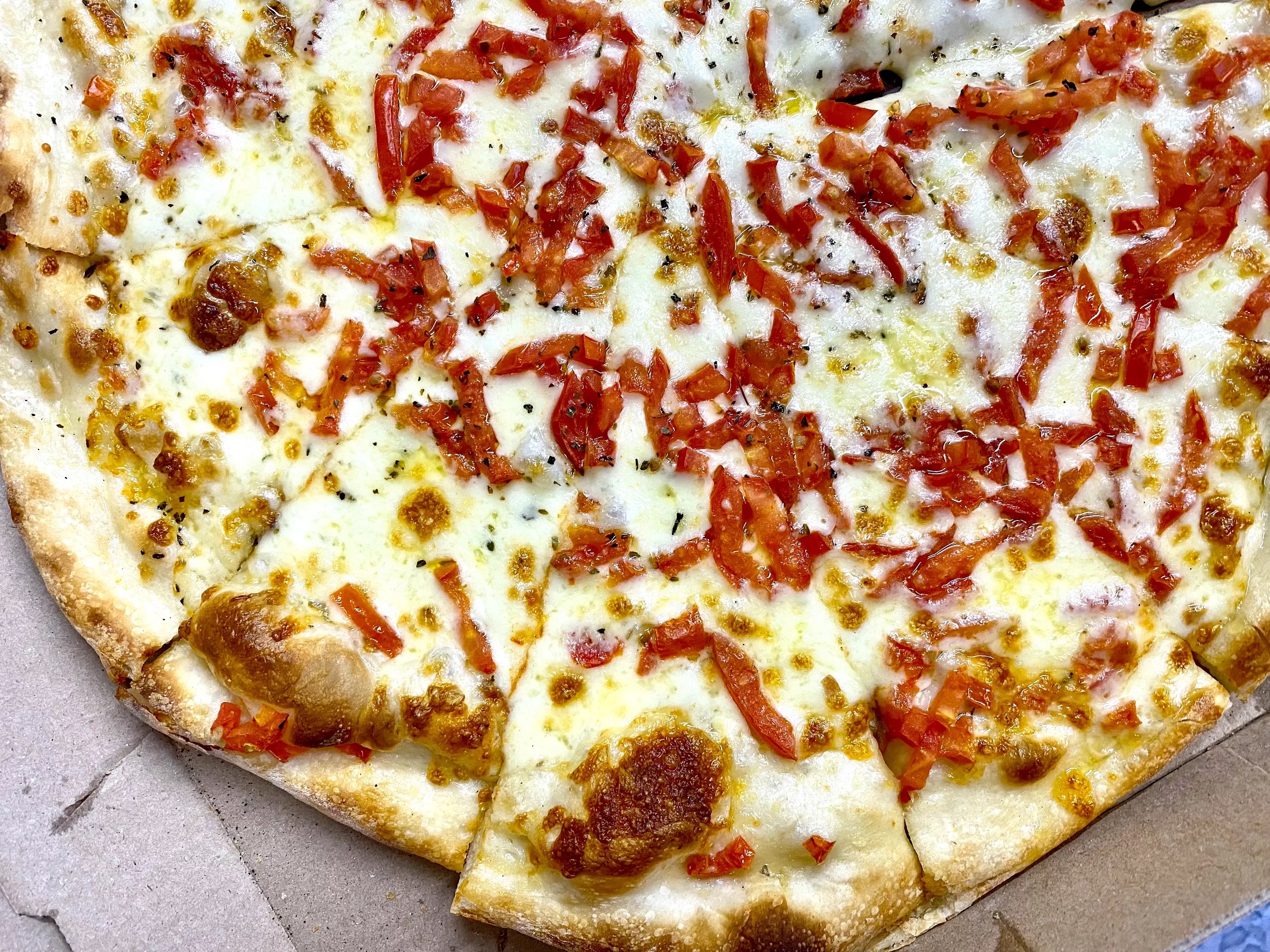When you want a no-frills, no-nonsense, unpretentious white pizza, Red Devil is your place. Made simply with olive oil, mozzarella cheese, fresh garlic, and studded with just the proper ratio of sliced Roma tomatoes on top, the large pizza is a whopping 16 inches across with ultrawide, super-foldable slices that would almost be too cheesy if it weren’t for the tang of the tomatoes. Ideal for takeout and feeding hungry families, we just have one gripe: there can be a lot of crust, so you might want ranch for dipping.