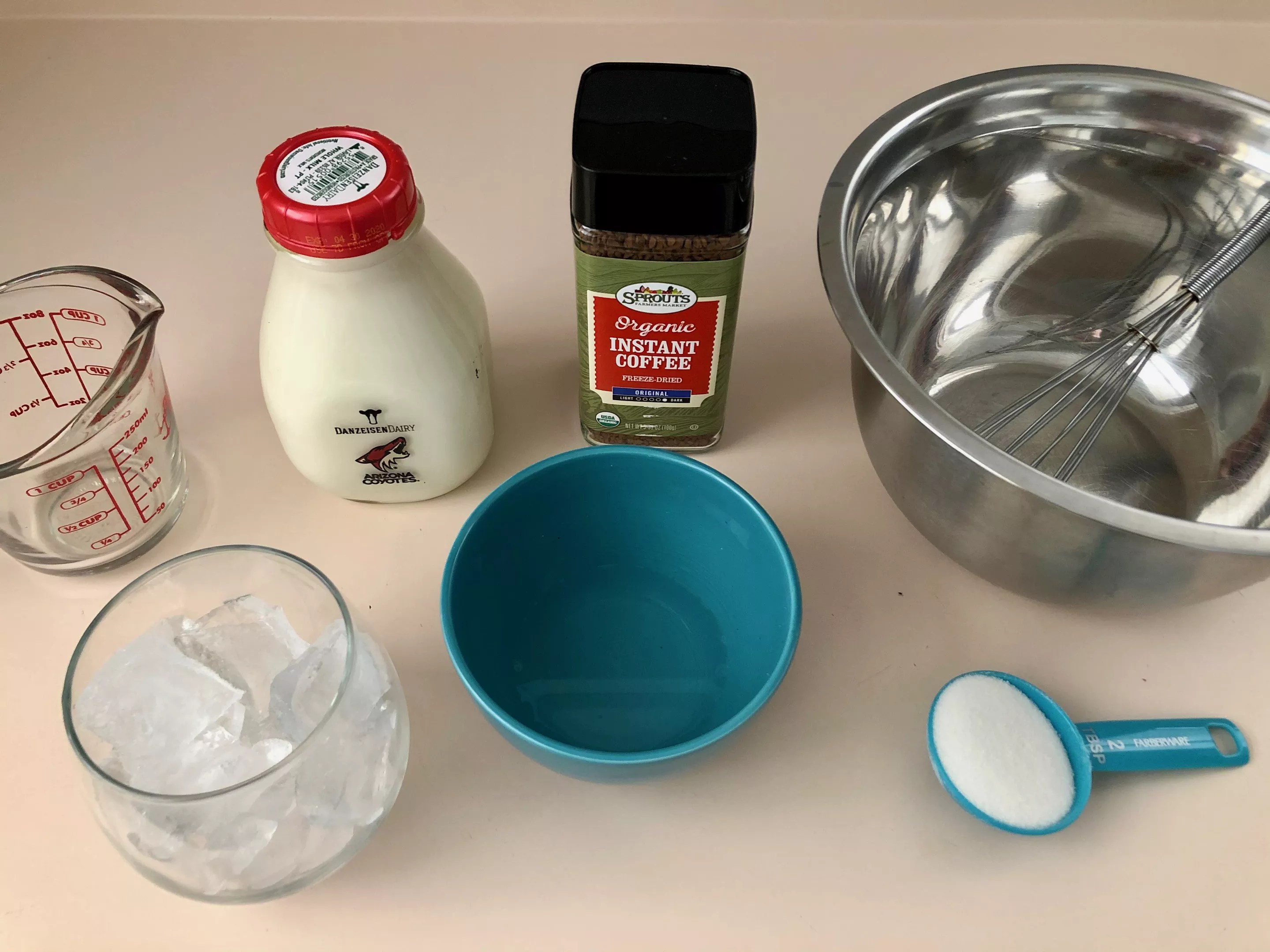 Some of the extremely simple recipes found online (okay, they’re all extremely simple) calls for two tablespoons of instant coffee, two tablespoons of granulated sugar, and one cup of whole milk.