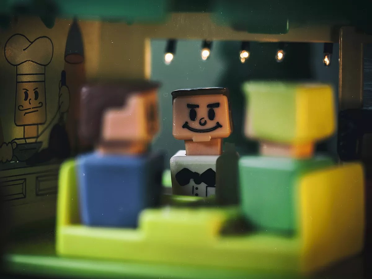 About the toys: Between 1974 and 1977, Playskool produced a charming series of “Familiar Places” playsets. Not to be confused with Fisher Price “Little People,” these 2-inch figures were square and nicknamed “Blockheads.” The playsets enabled them to visit a McDonald’s restaurant, a Holiday Inn, a Texaco gas station, a national park – and now, this Chow Bella series.