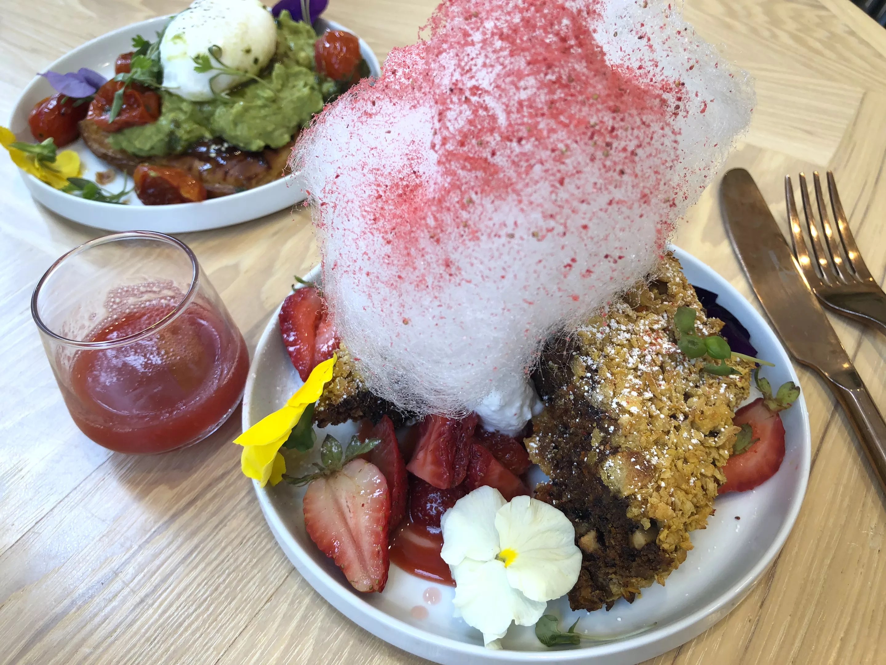 Around the cereal-encrusted slabs, are edible flowers from northern Arizona. On top of the French toast teeters a poof of house-made cotton candy, dusted with powdered freeze-dried strawberries and specks of basil. Under the cotton candy, entombed within the toast, is a sweet coconut cream.