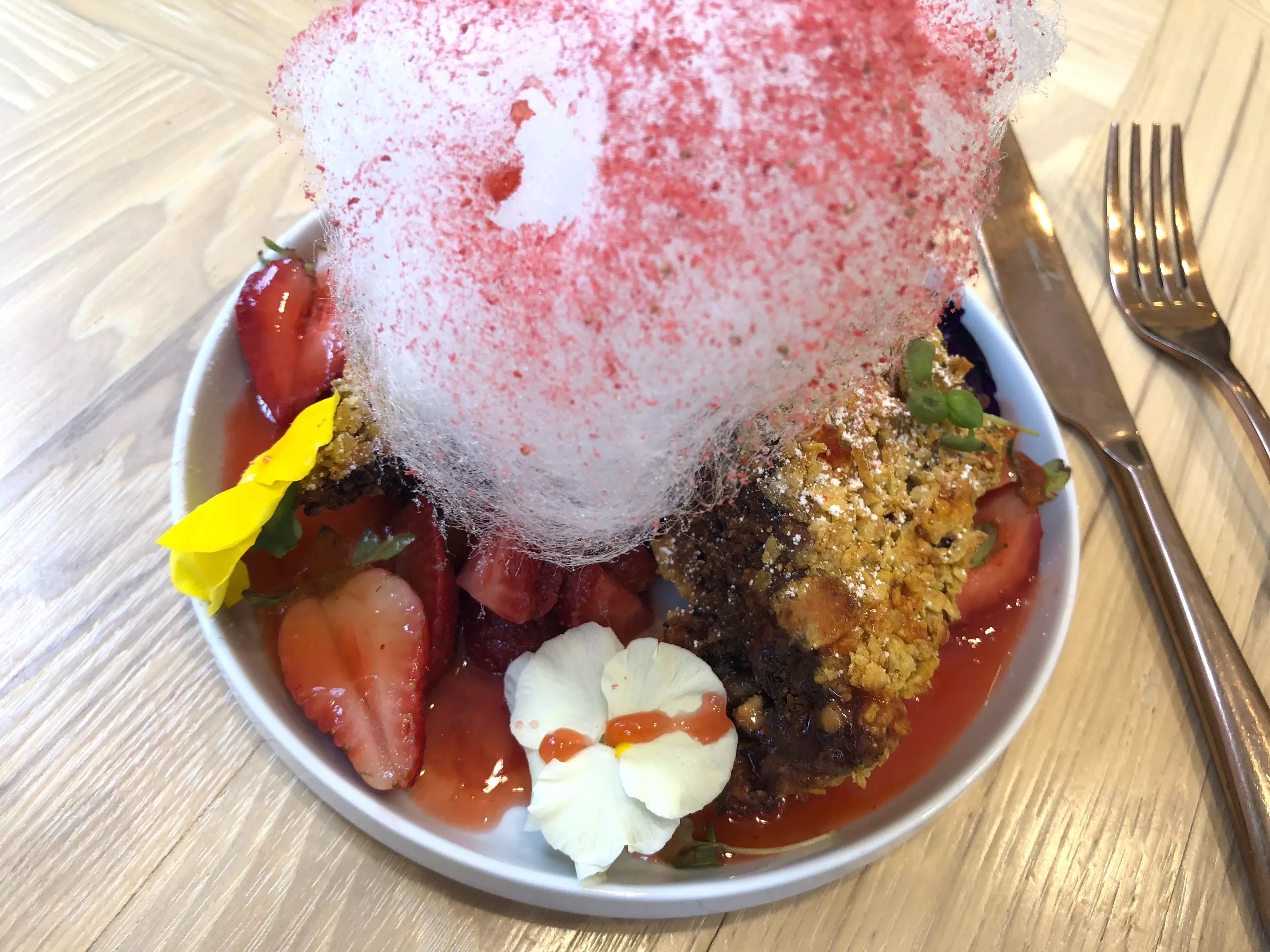 What looks like a tiny stemless wine glass comes on the side filled with strawberry purée. This is “syrup.” You pour it into the dish, on and around the toast, slicking edible flowers and macerated strawberries.