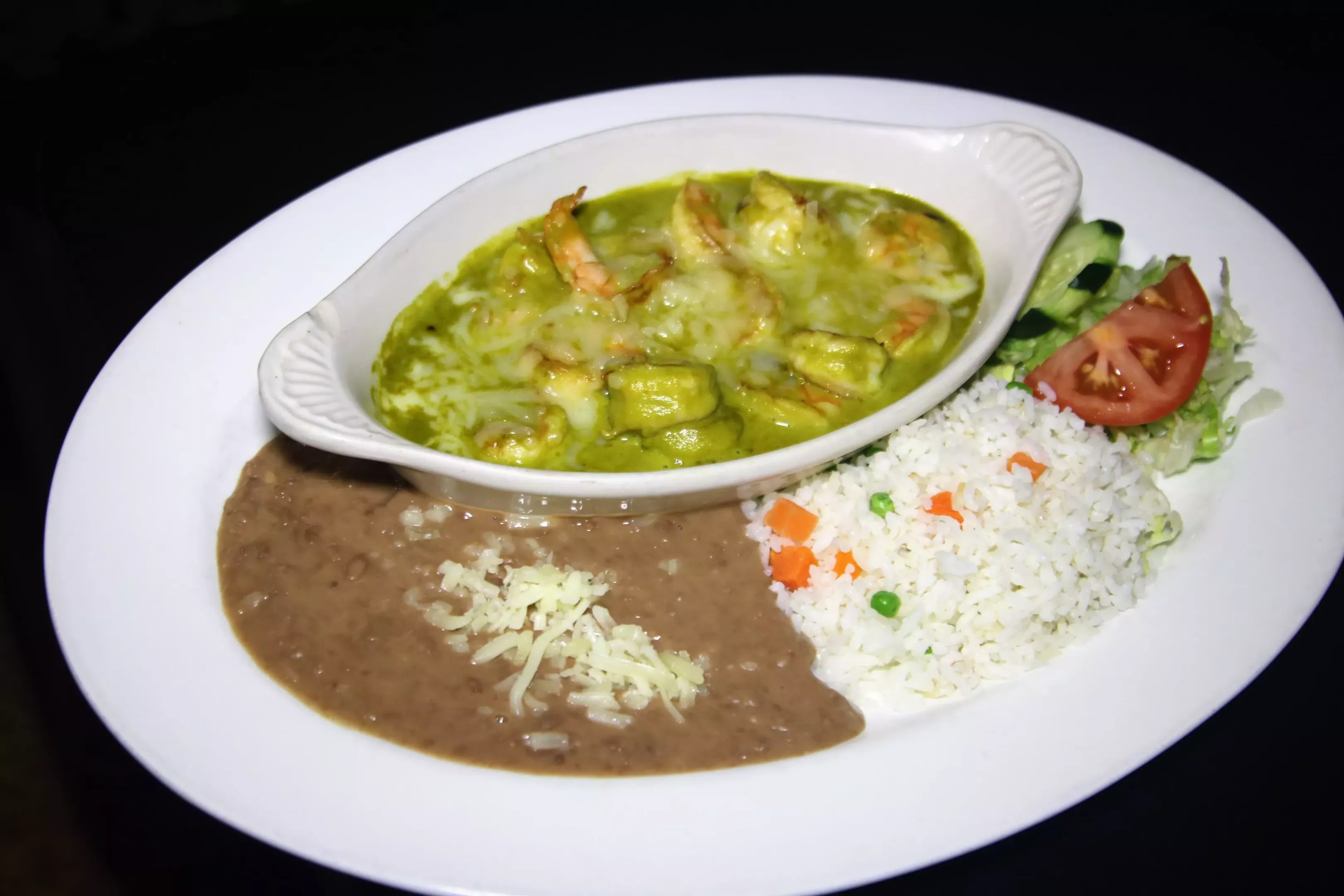 Green Shrimp is a dish covered in a rich sauce made from three types of chiles, cream and melted cheese.