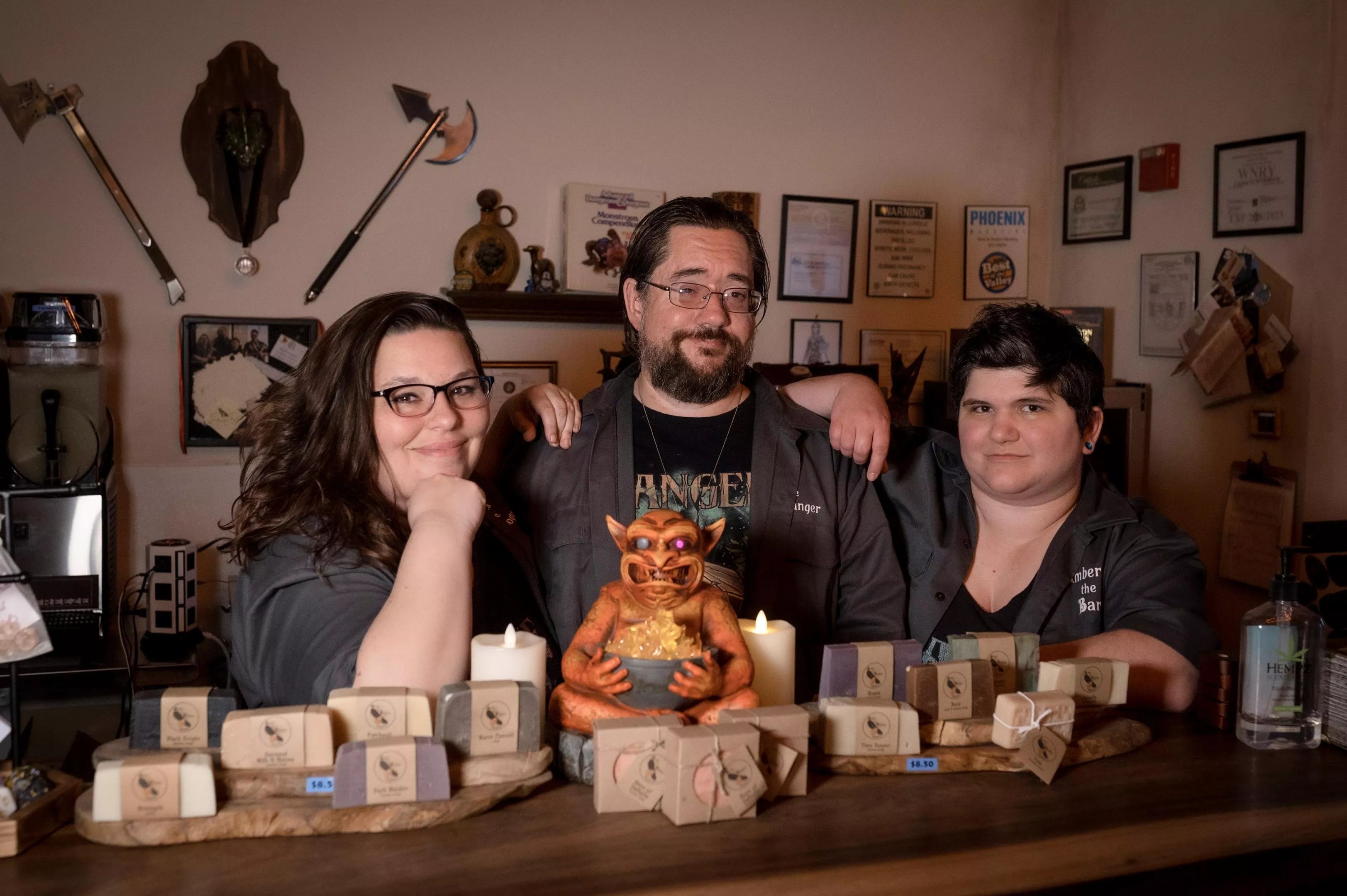 Huge Celtic tapestries hang on the wall with swords, shields, ravens, gothic knick-knacks and merch to purchase including the namesake T-shirt reading “Come to the Mead Side, We Have Honey.” On a recent visit, the shirt, which features classic “Star Wars” yellow print on black, was the outfit of choice for co-owner and mead maker Ben Chaney.