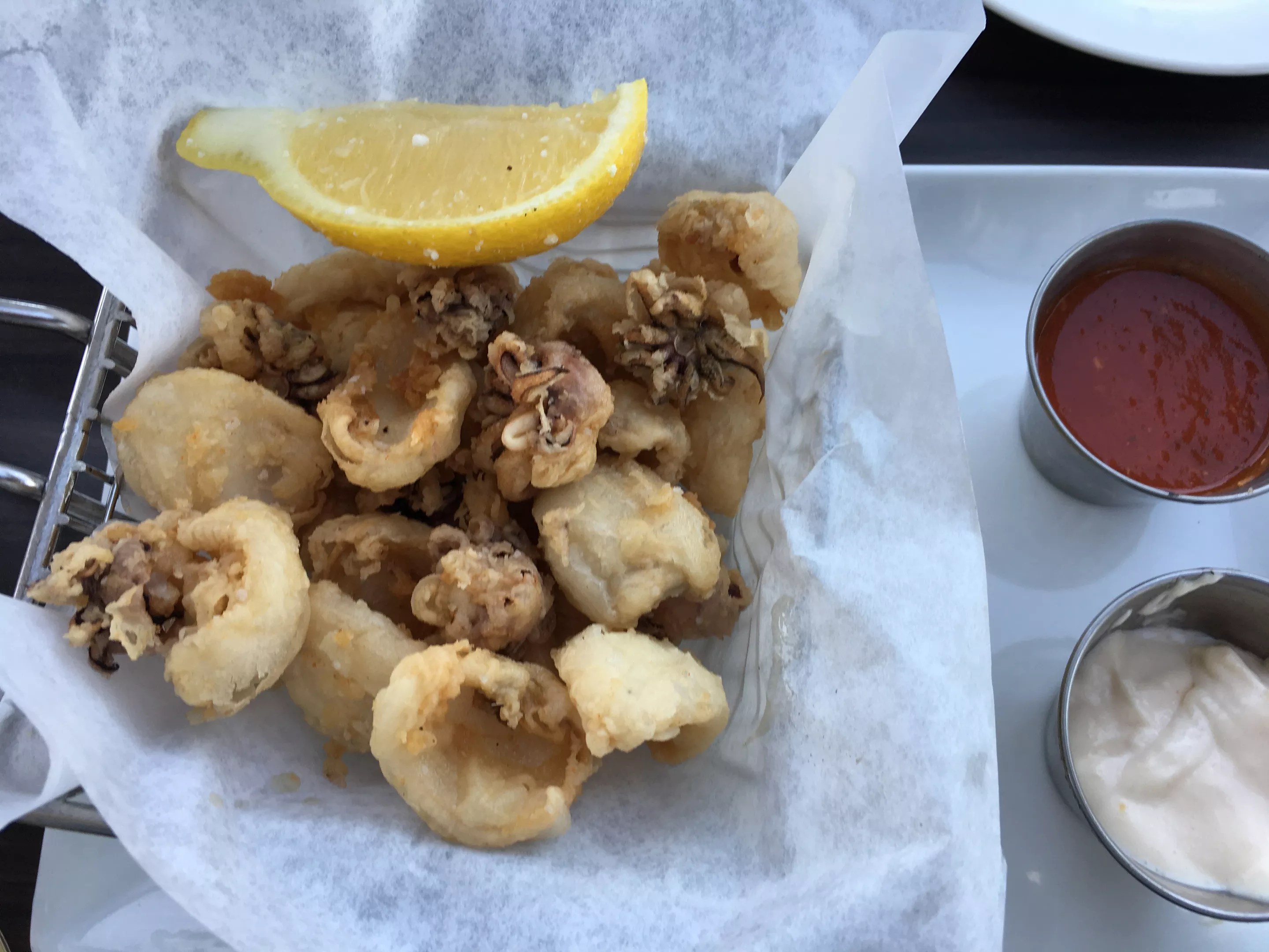 My wife and I went with cuttlefish. Curls of fish had been dusted with semolina, fried, and served in a miniature frying basket. They tasted great. Semolina made for more of a granular breading, one that pushes back on your eager bite almost imperceptibly before yielding. The cuttlefish had good salt. Zapped with a lemon squeeze or two, the morsels satisfied in a simple way and triggered visions of blue water and beaches.