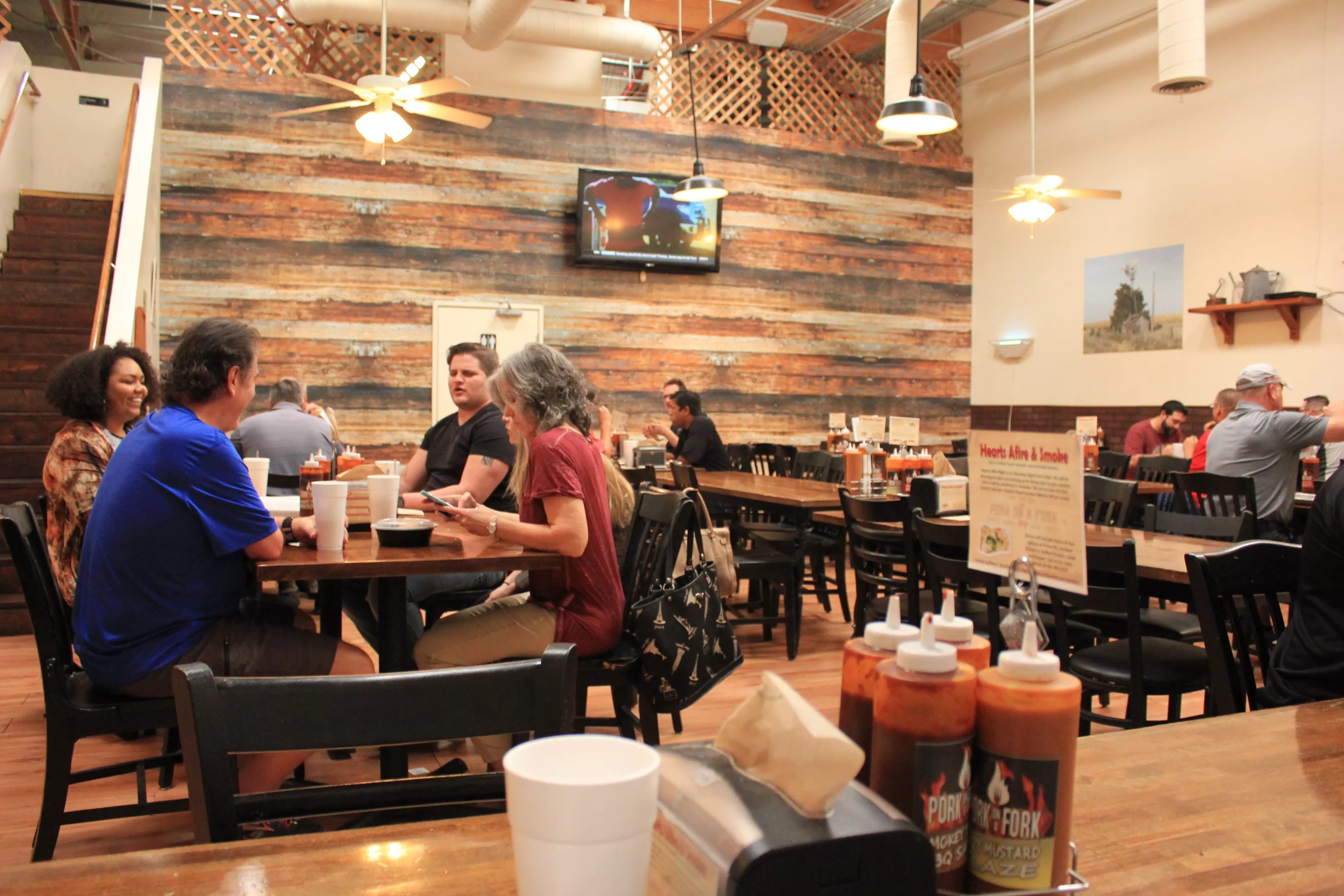 The original Deer Valley Pork on a Fork is marooned in an office park. Corporate folks briefly escape the office rigmarole, kick back, and savor slow-smoked meat. These days, the spot has ample seating. What was once a garment shop behind the restaurant has been converted into a high-ceilinged dining room where pictures of the family farms hang, smoky aromas drifts, and the jammy music of artists like The Allman Brothers and Jimi Hendrix rains from a sound system on the second level. Diners coolly fork up mac and cheese made with three cheeses, one of them a nostalgic Velveeta. Eaters polish off rolls and potato salad, each made from Hansen’s grandmother’s recipes.