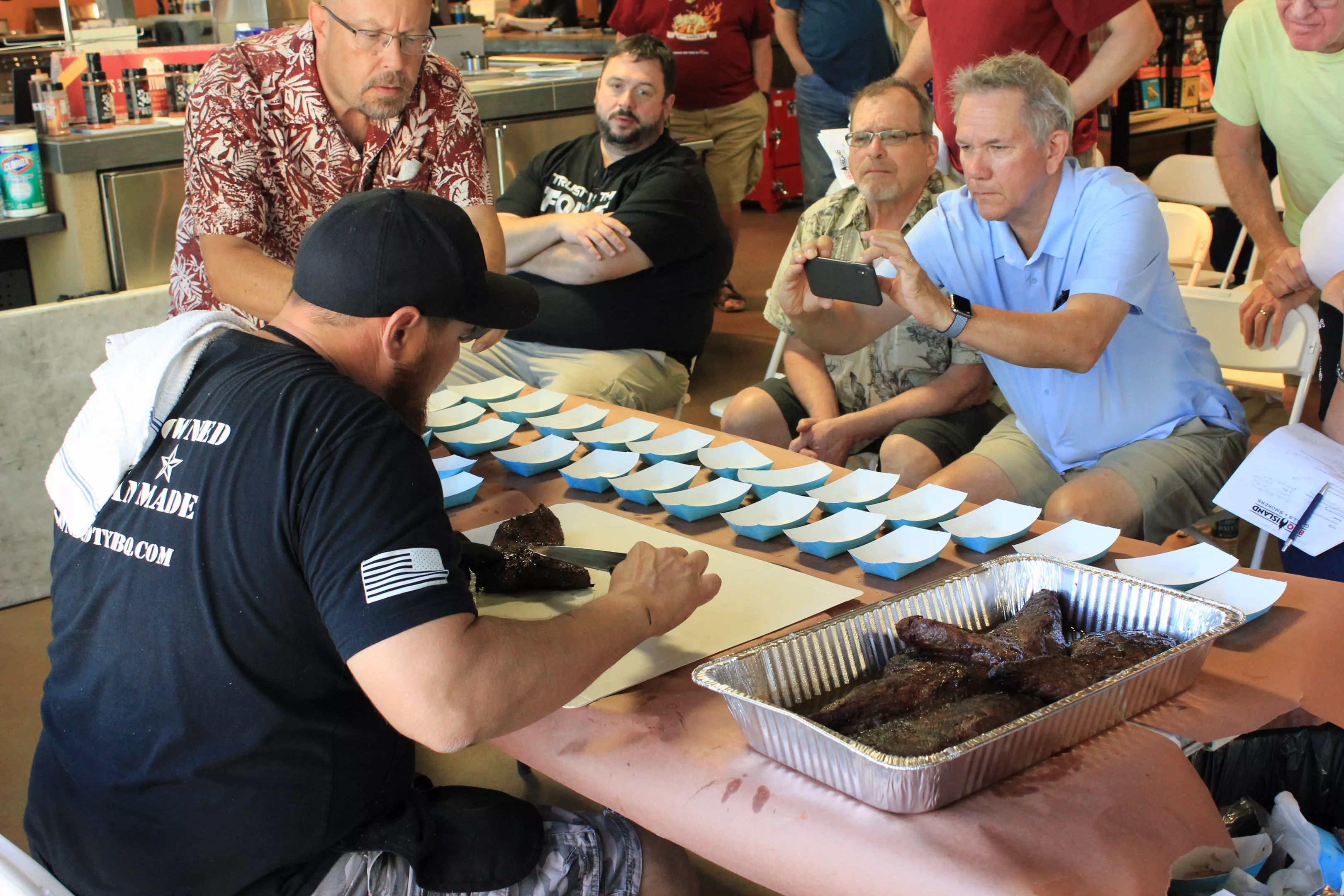 Smith strains his voice so his words can be heard clearly. His 32 amateur barbecuers have paid $99 each for his professional advice. They are snapped to attention, ready to sponge up wisdom on the day’s next smoked meat. Behind Smith, outside on the sunbaked pavement, four smokers puff away. His words carry: to his seated class … to shelved aisles stacked with tongs and wood chips … to metallic grills and matte smokers … and to the lusterless orange corners of his temporary classroom, a BBQ Island store in north Scottsdale.