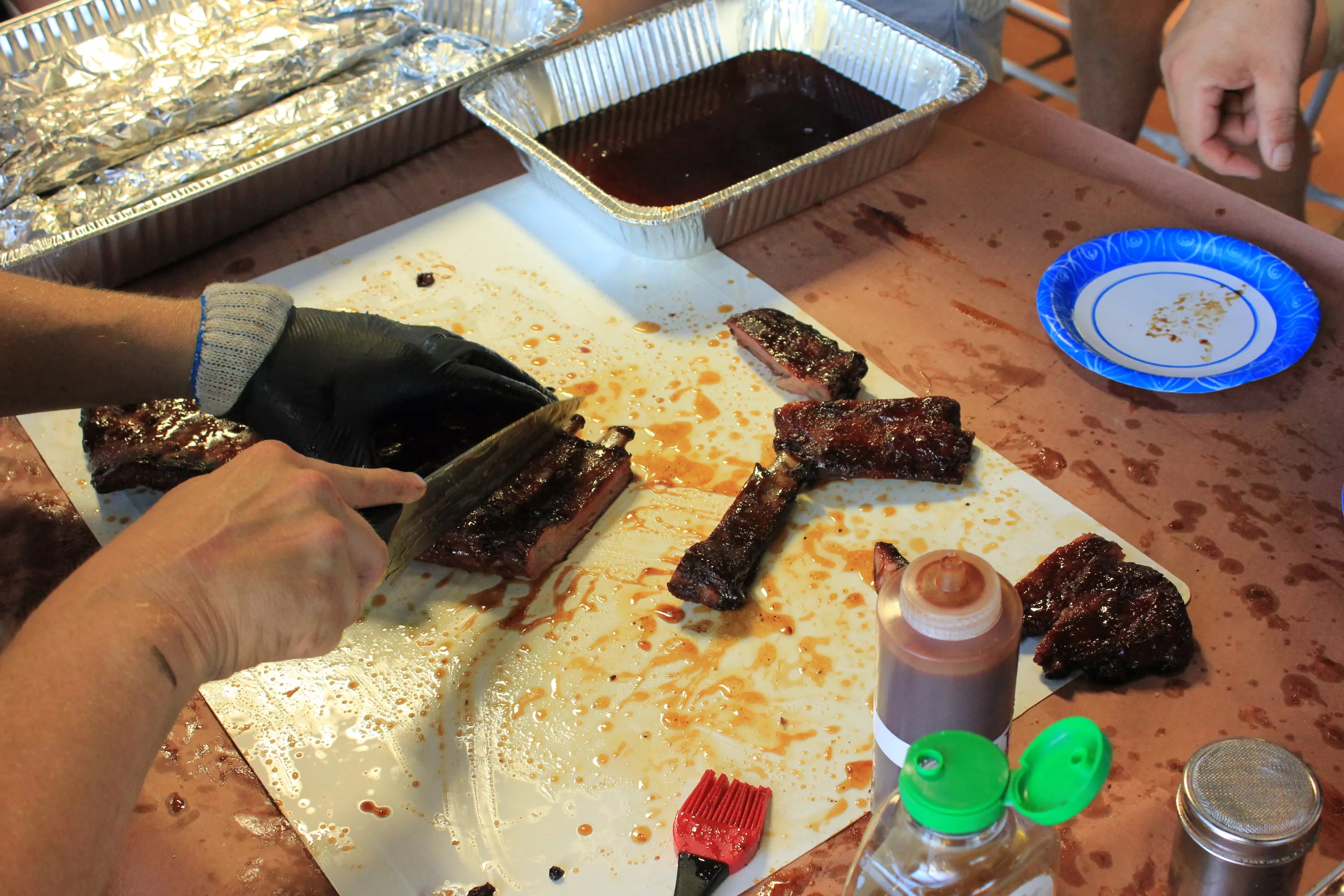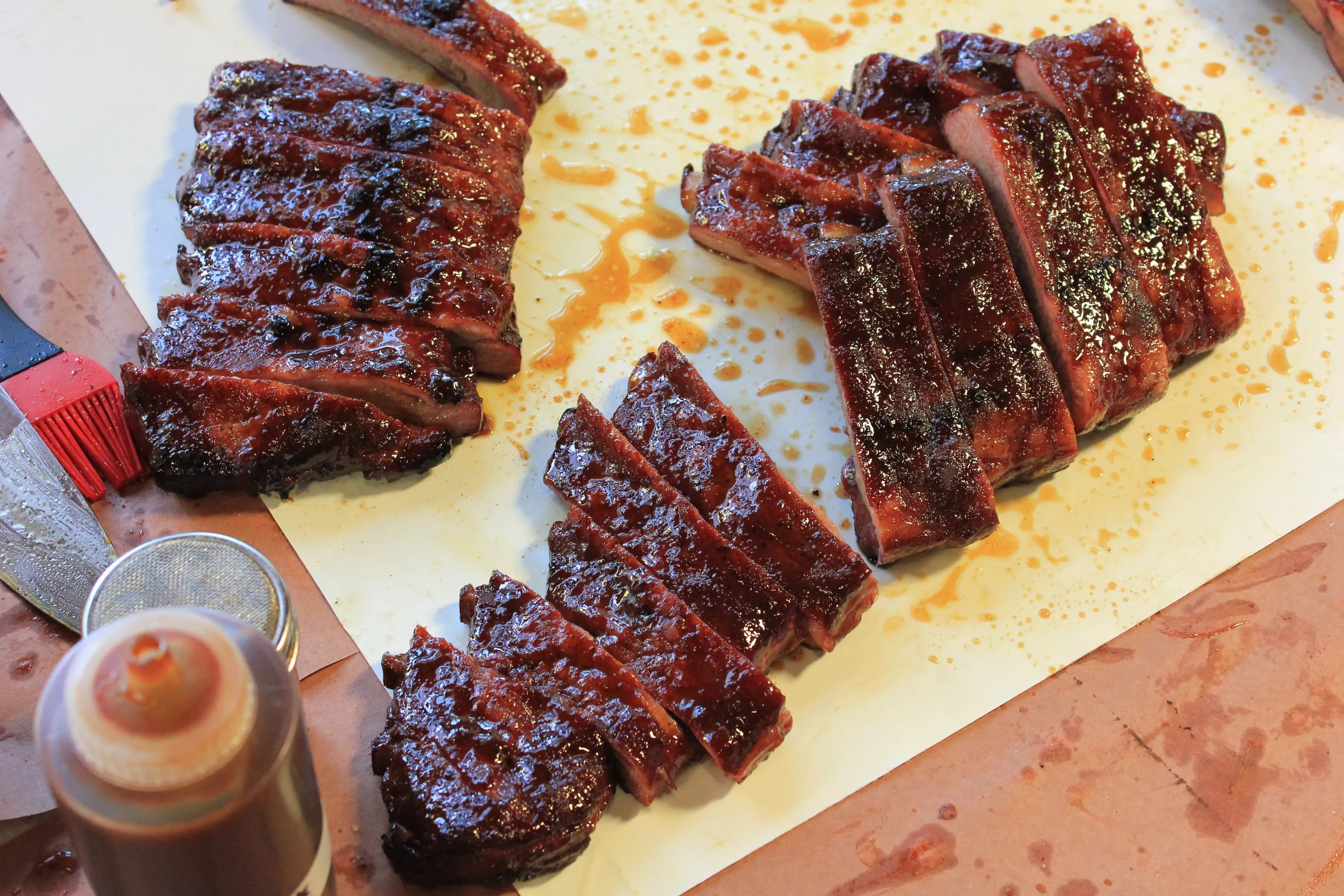 Cutting smoked St. Louis-style ribs.