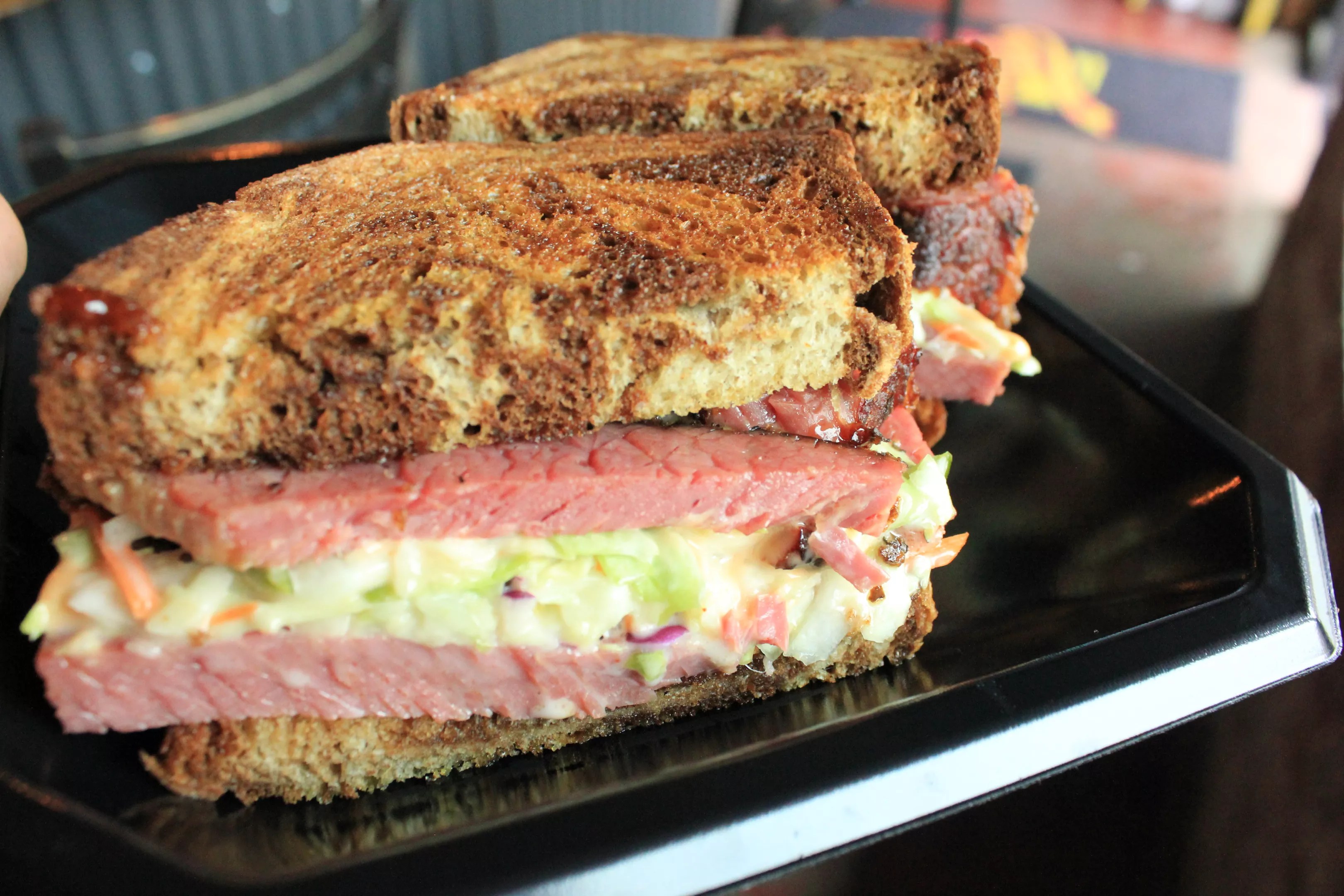 Being from New York, Johnson has high pastrami standards. His pastrami begins as uncooked brisket brined for five days. After smoking, the meat has a soft pink interior almost like ham. It disappears between your teeth and teases you with a salty, faintly smoky flavor. If you want to properly evaluate its quality, get pastrami as part of a meat platter. On a sandwich, bread and coleslaw tread on the meat’s nuances.