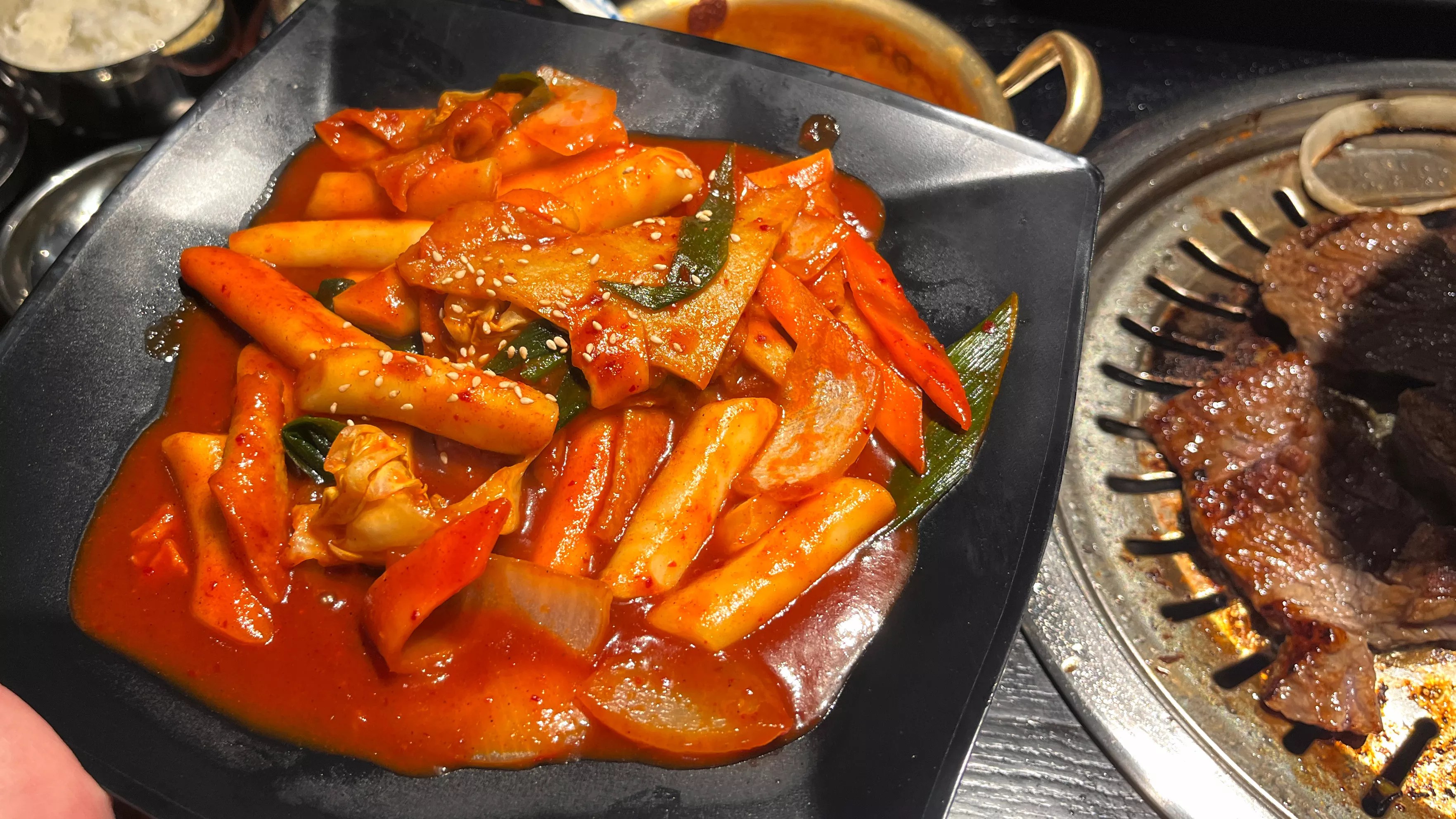 I wish I could say the same of the spicy squid stir-fry, which spent too much time in the wok and might as well have been vulcanized. But the toppoki (Dukboki? Tteokbokki?) is a great pick, however you Anglicize it – slippery and supple cylindrical rice cakes swimming in a deep red sauce of fermented chile paste.