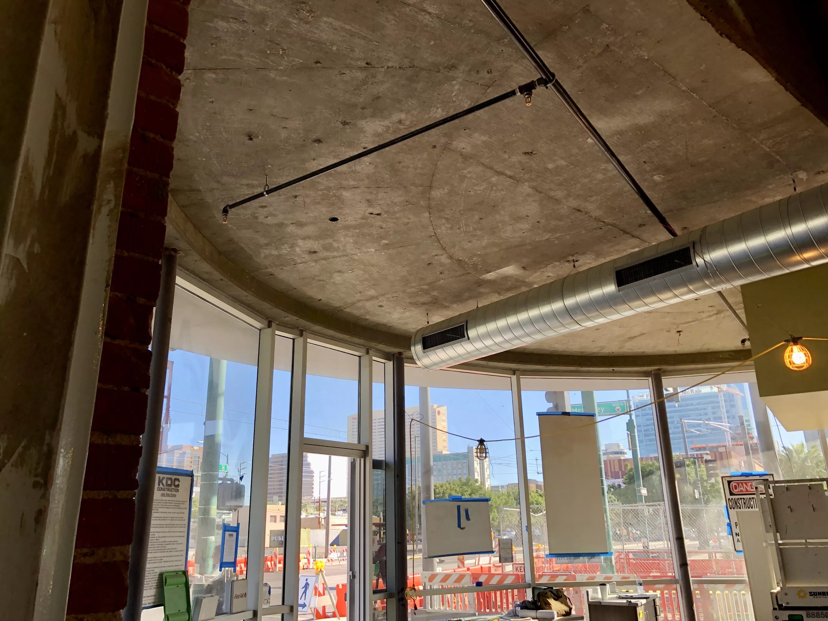 And this particular Snooze will have a few features not found at other Arizona locations, including the mezzanine and upstairs seating, and of course, proximity to the Valley Metro Rail. However, the spot will be keeping some features of the original suite, including the rounded front window, some original brickwork, and the dangling vinyl record display which some may remember from the record store days.