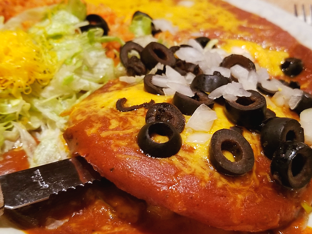 Or try instead Poncho’s take on a true regional Arizona-Sonora borderland specialty: Sonoran enchiladas, a dish that’s been documented in Tucson and Phoenix Mexican restaurants for at least a century: The fried masa patties are bathed in the restaurant’s homemade enchilada sauce and garnished with chopped white onions and black olives. Their soft crispness and corn sweetness is a nice contrast to the savoriness of the oregano-spiked red enchilada sauce. Sonoran enchiladas are kind of a rare restaurant find these days, but they’ve never left the menu at Poncho’s.