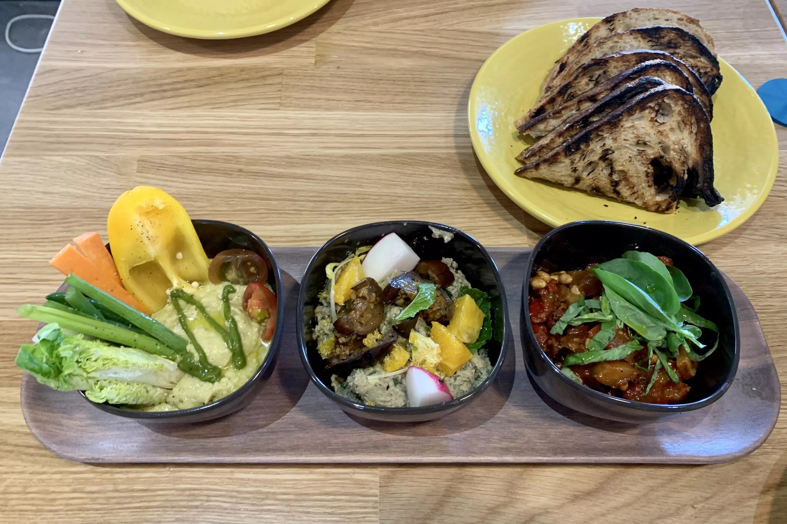Tasting of Three is hummus, babaganoush, and Sicilian caponata with grilled Noble Bread.