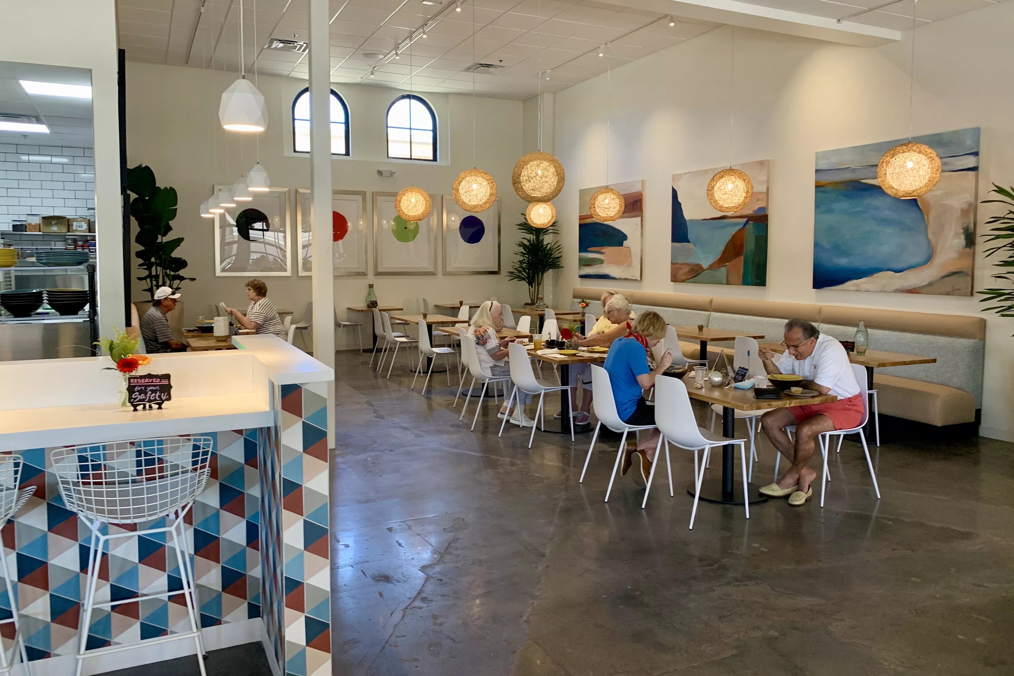 We made it there last week. At lunch, this quick-service restaurant is bright with natural light; strung-up globe lamps offer more lighting. Colorful, abstract beach paintings cover the walls. Beachwood-looking tables with white chairs are set in neat rows across from the ordering counter.