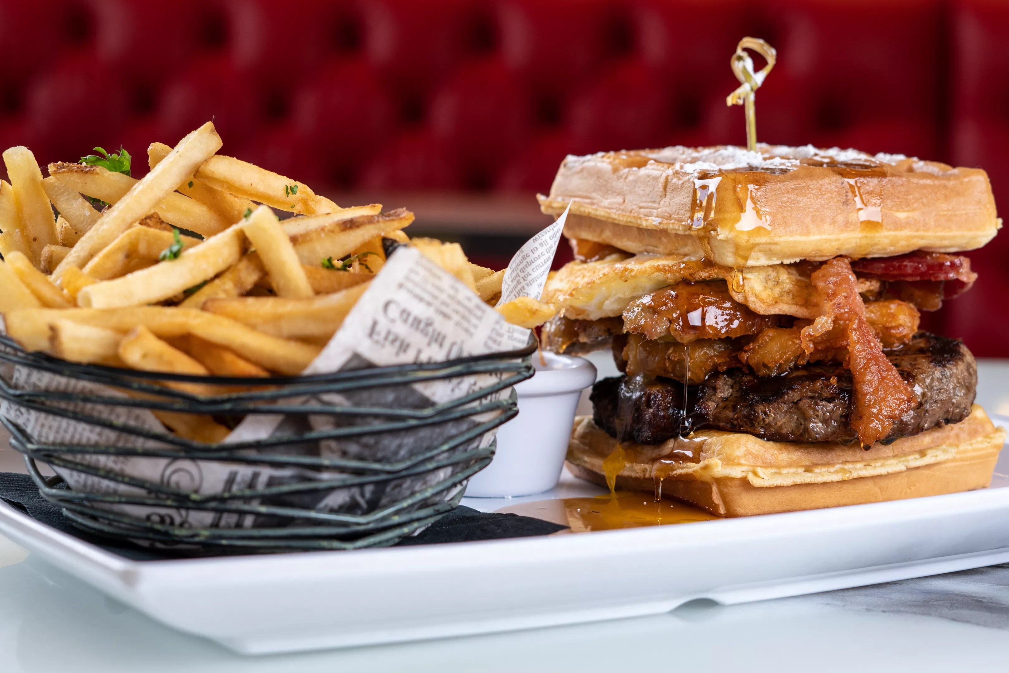 To truly blend the concepts of breakfast and dessert, try the Maple Grand Slam, made with vanilla ice cream and topped with silver dollar pancakes, mini waffles, crispy maple bacon, whipped cream, and a maple syrup drizzle.
