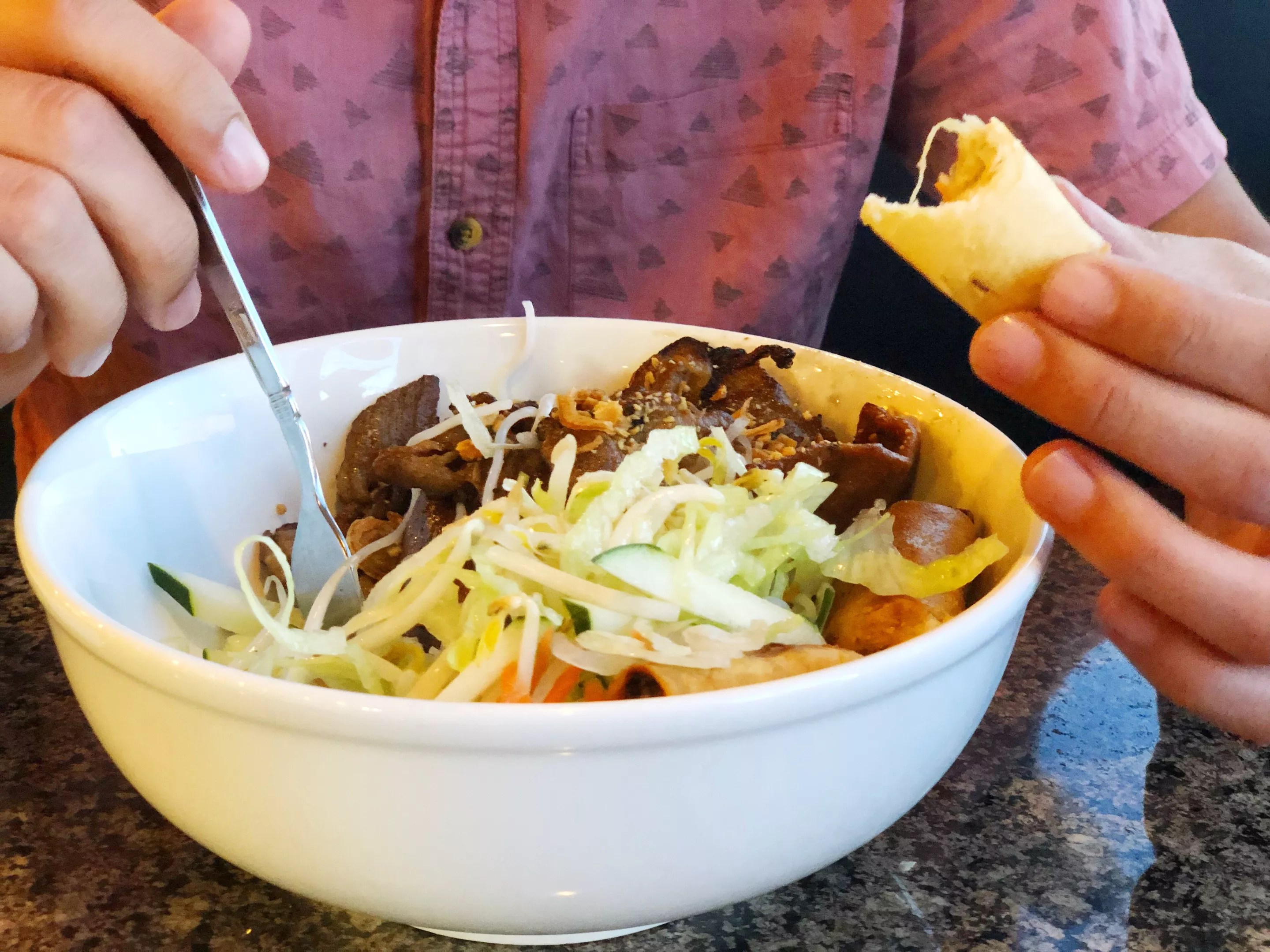 Barbecue pork and deep-fried egg rolls rest on a bed of vermicelli rice noodles and shredded cucumber, lettuce, Thai basil, and sprouts.