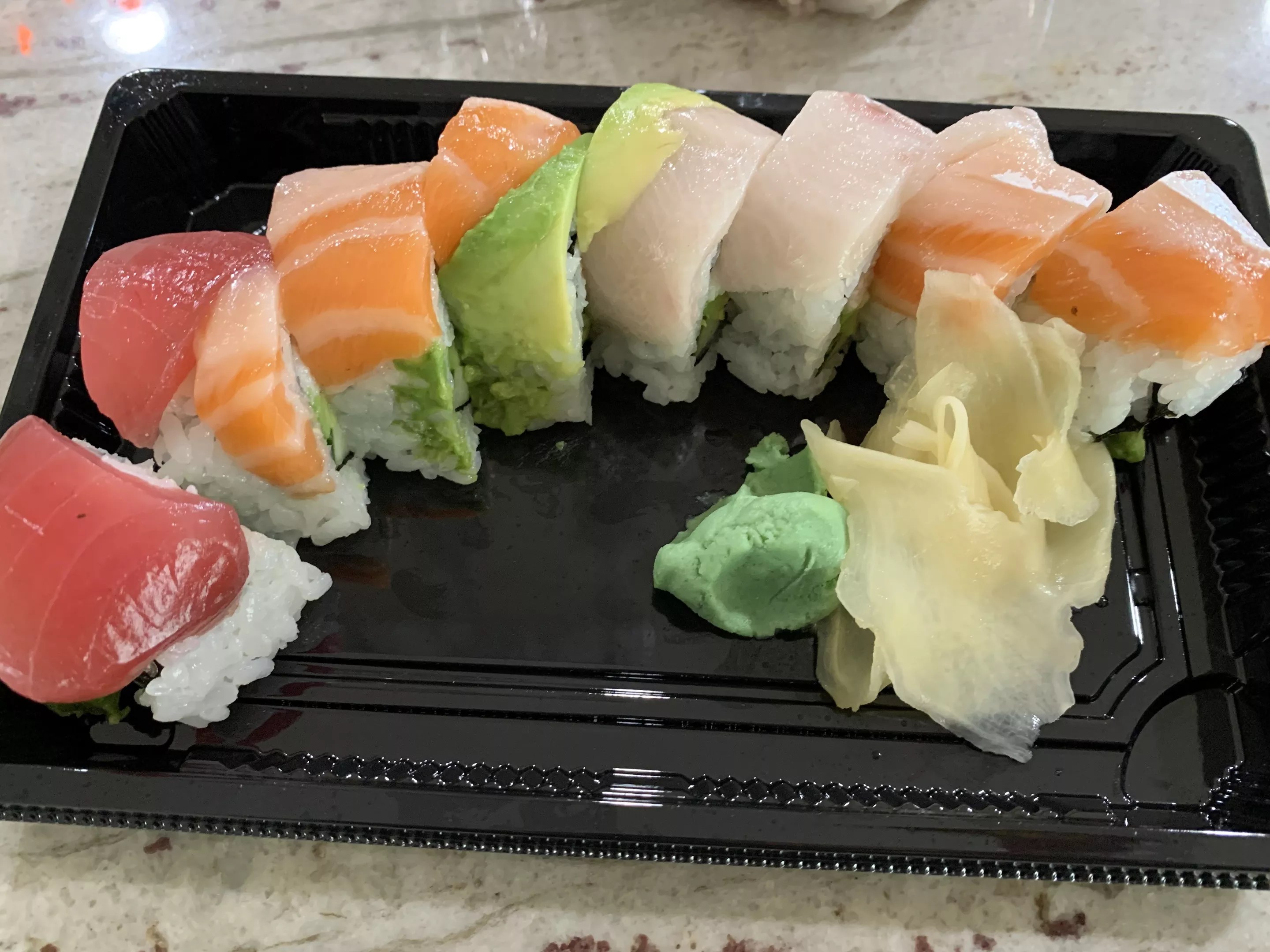 The Rainbow Roll at Sushi Friend includes salmon, tuna, and avocado draped over a crab mix sushi roll.