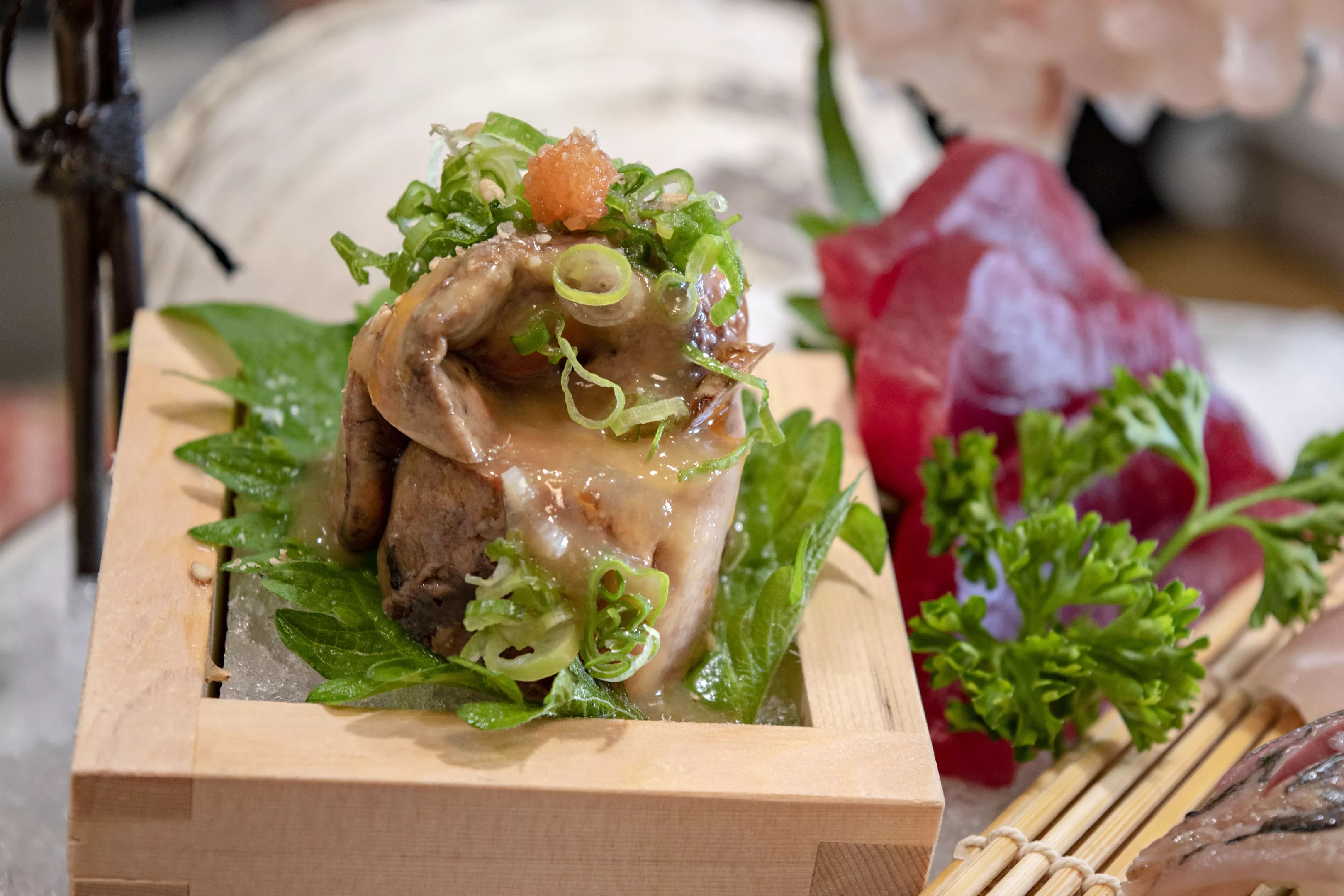 Monkfish liver with snapper, Spanish mackerel, and yellowtail