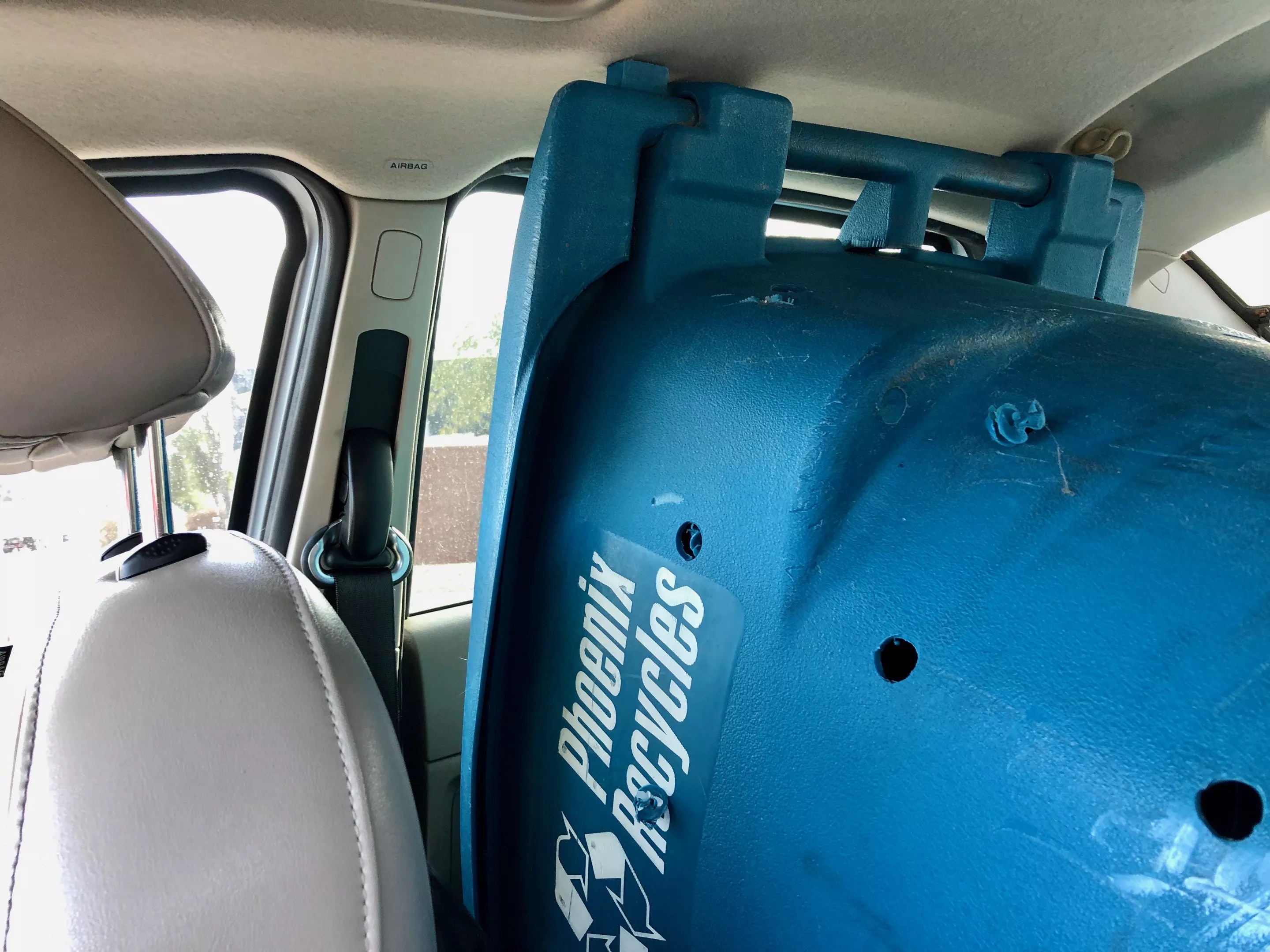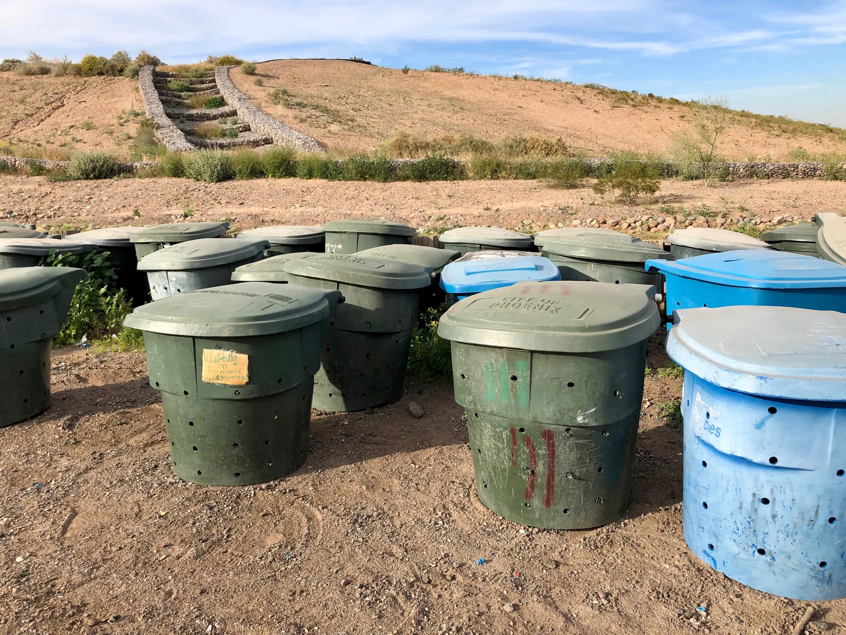 Phoenix compost containers are constructed by inmate work crews from old garbage and recycle cans, and are available for purchase for $5 flat – cash or card. You can pick one up at one of two transfer stations – the North Gateway Transfer Station or the 27th Avenue Transfer Station. It’s advised you call ahead for availability as containers are on a first-come, first-served basis. And no, they will not reserve a container for you.