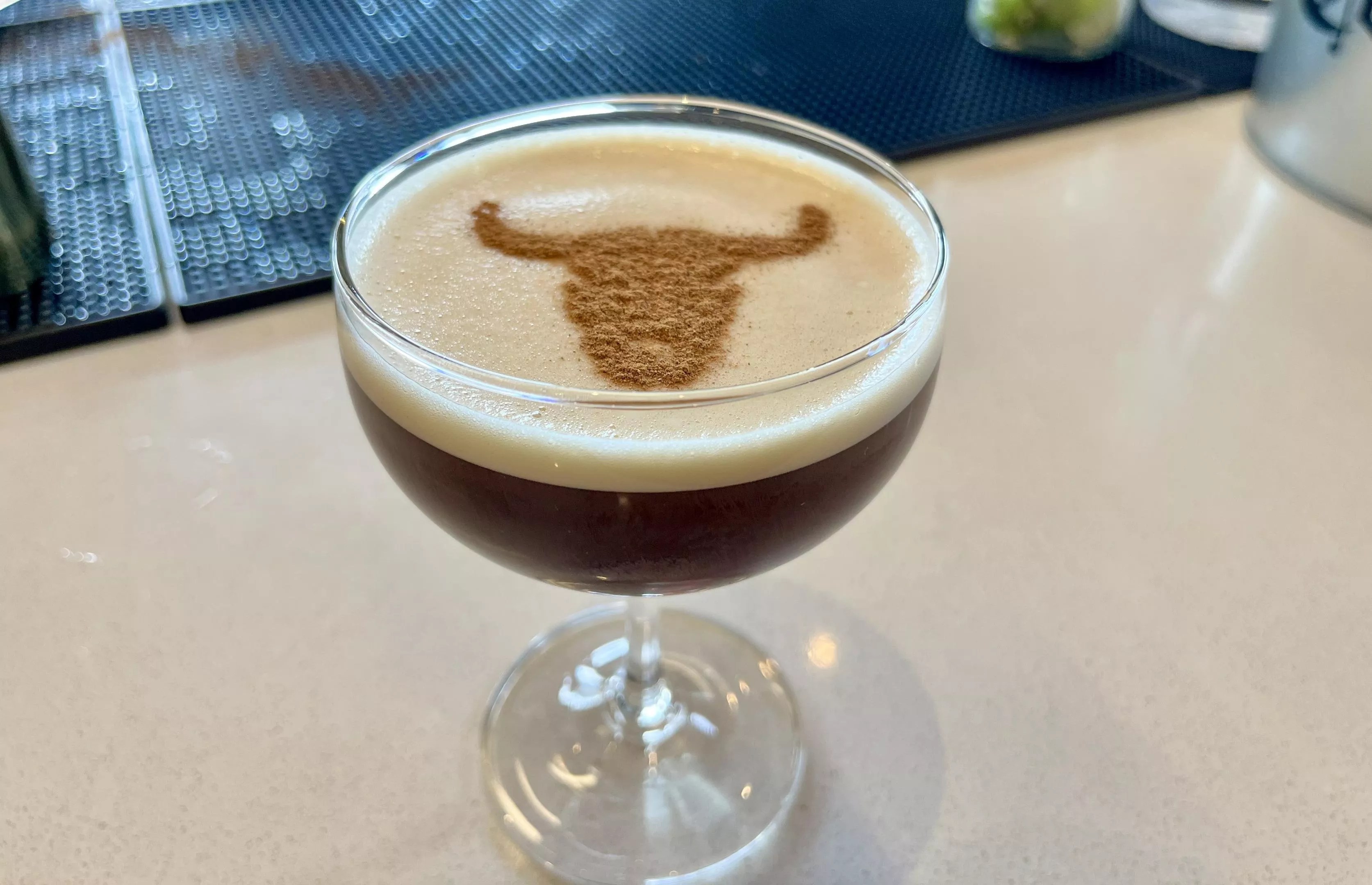 Ward uses Giffard coffee liqueur, cinnamon dolce and agave syrups and espresso that’s brewed in batches onsite. The chile liqueur Ancho Reyes, which gives it a hint of warmth on the finish, and a stenciled dusting of cinnamon in the shape of a longhorn offer unexpected twists.