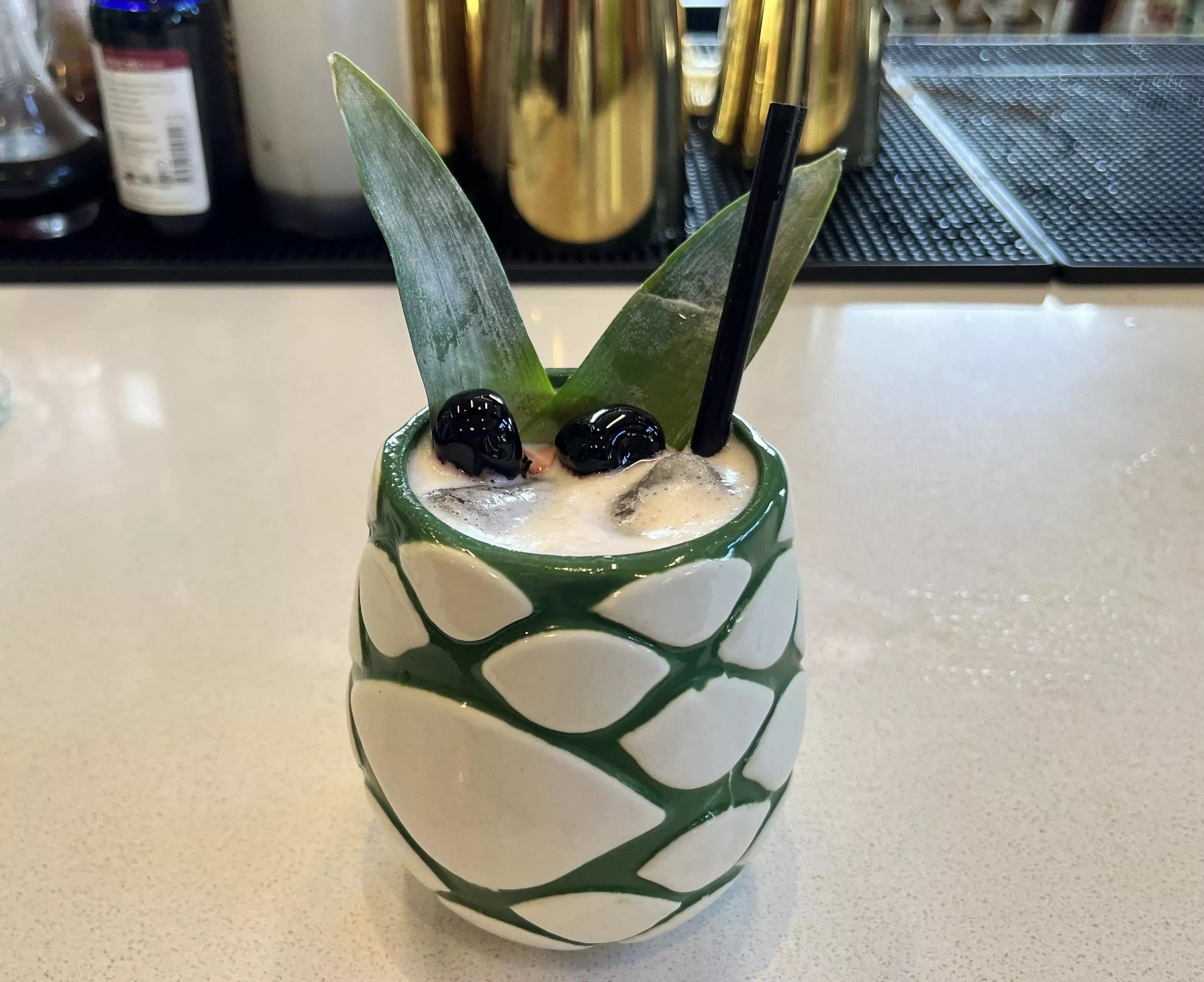 The Quetzalcoatl cocktail is made with rum, pineapple, lime, orgeat, Aperol, passion fruit and Bittermans Elemakule Tiki Bitters. It’s garnished with marasca cherries and pineapple fronds.