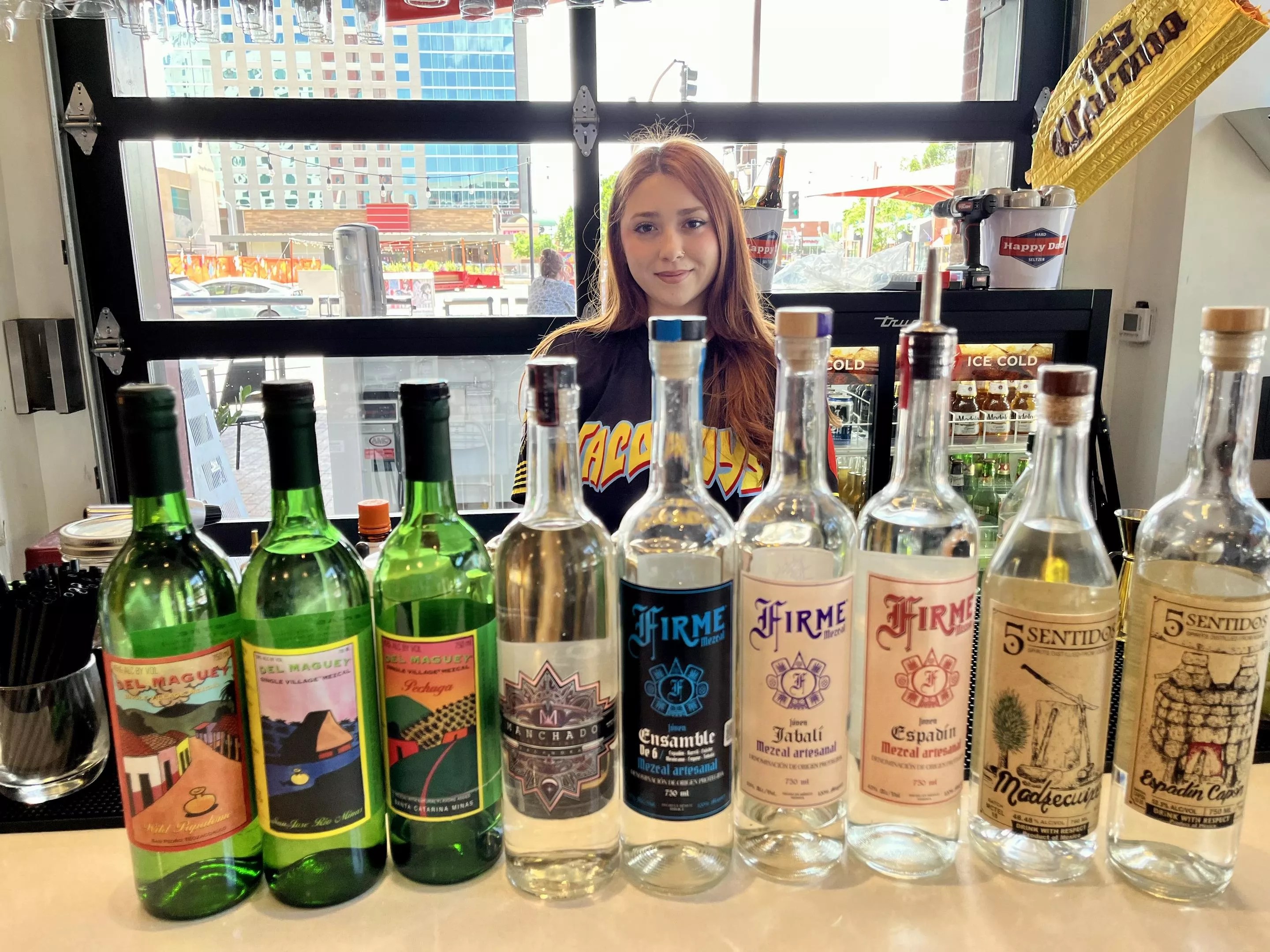 Rebbeca Estrada, bar manager of the downtown Tempe location of Taco Boy’s, stands behind some of the shop’s agave spirits collection which features hard-to-find labels.